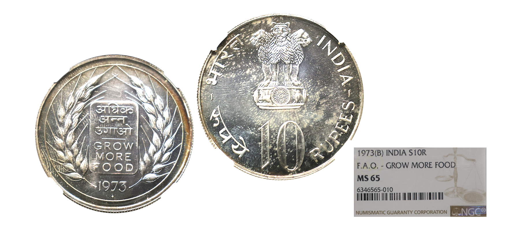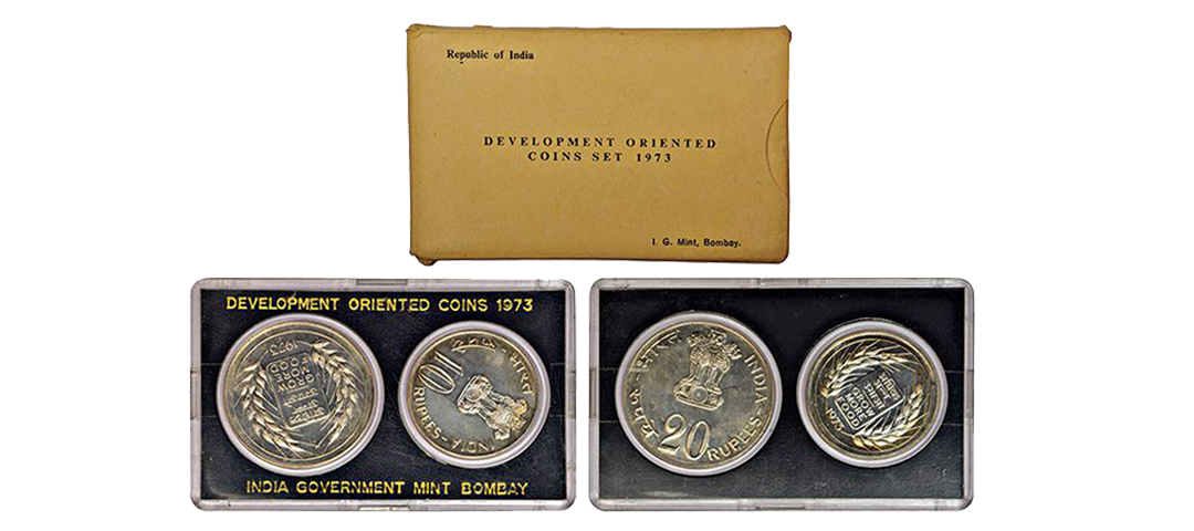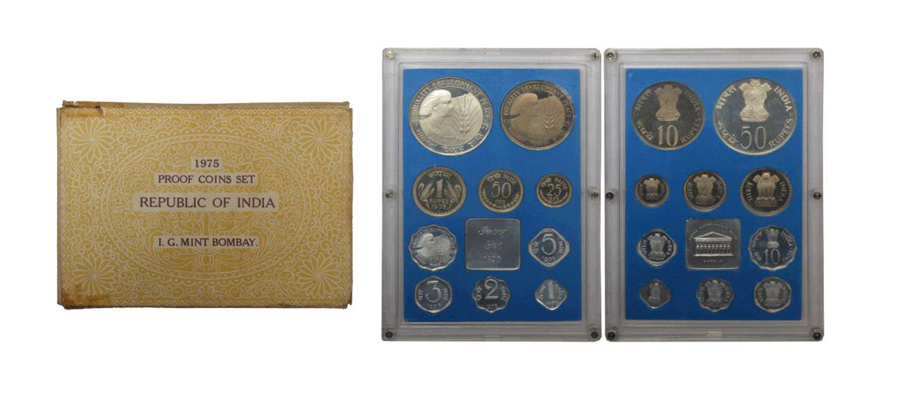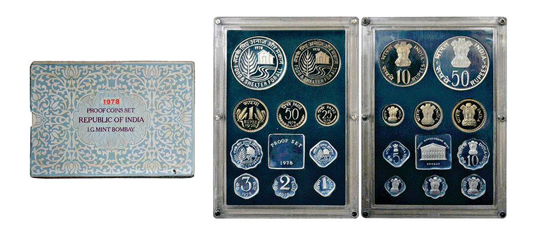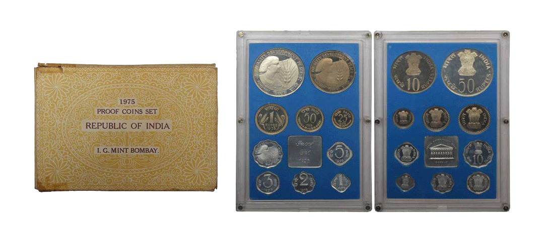 1971, Food for All, VIP Proof set of 9 coins, 10 rupees, 1 rupee, 50 paise, 20 paise, 10 paise, 5 paise, 3 paise, 2 paise and 1 paisa, Bombay mint, RB 27, in original mint packing