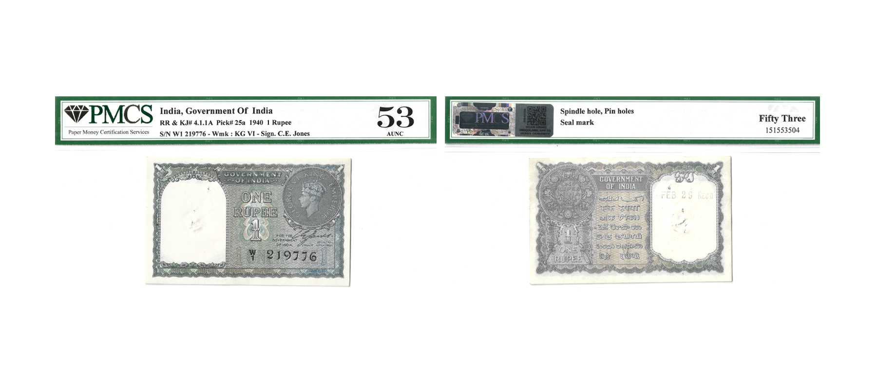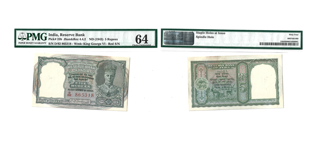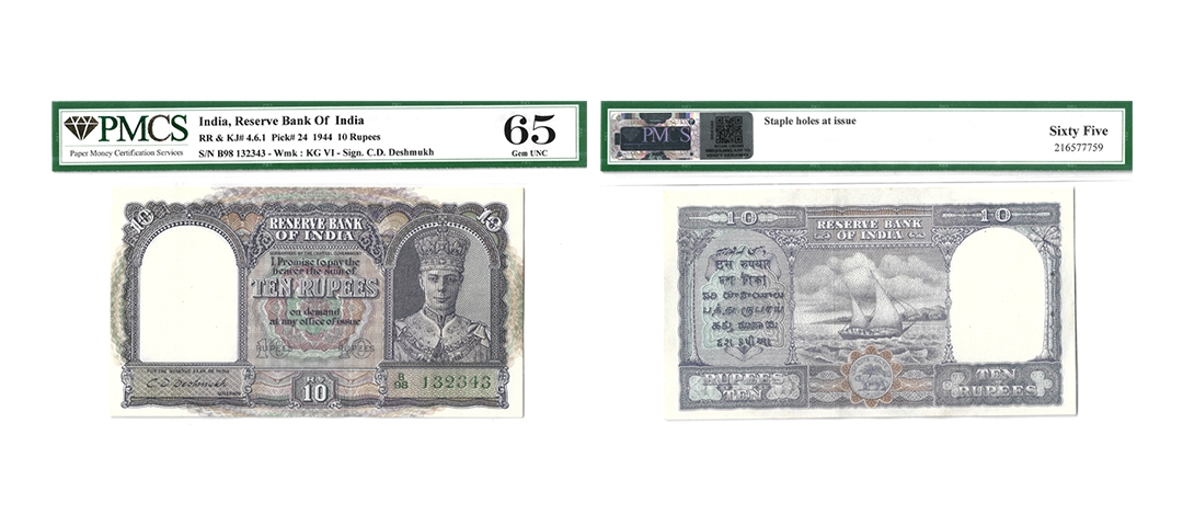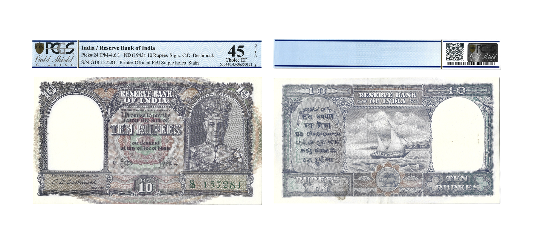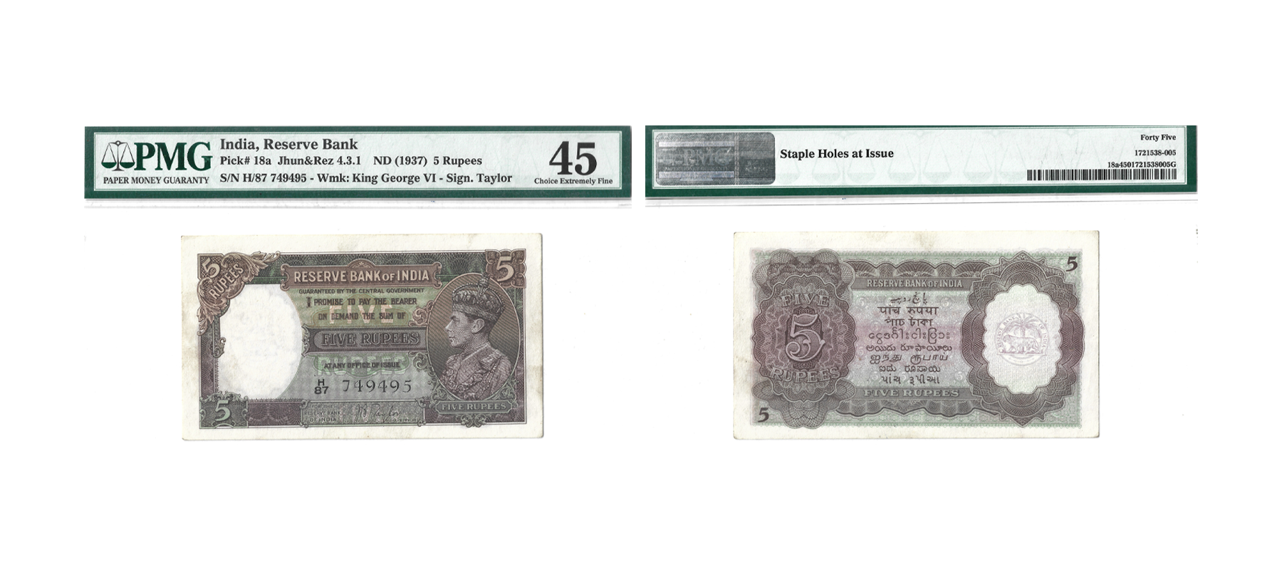 Bank of Madras, 100 Rupees, hand signed, dated 10th June 1859-49 of date format 18_ _, type 2, serial no.: 11774. Obv: BANK OF MADRAS in semi circular on top, above the Vignette of Equestrian statue of Sir Thomas Munroe, Governor of Madras. Denominations in numerals on 4 corners, Bank of Madras written on top 2 panels in English, Persian, Telugu & Tamil and Denominations written on bottom 2 panels in the same 4 languages. Printed Serial 11774 on both halves. Manuscript Signature of Secy. & Treasurer, Robert Hunter. Printed by Perkins, Bacon & Petch, London. Rev: BANK OF MADRAS in big bold fonts and Denomination in big bold words. (J&R 1C.3.1.6.) printer PB&P, Graded by PMG 12 Fine NET. Note: two “CANCELLED” chop marks below each serial numbers, Repaired, Reattached at Center. Never seen earlier as issued notes but only known to exist as Specimen Proofs.