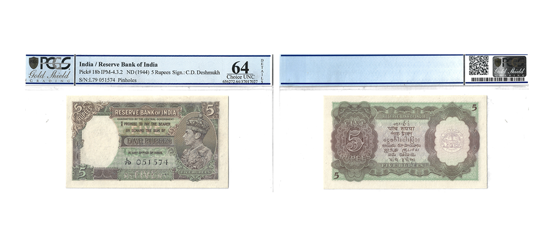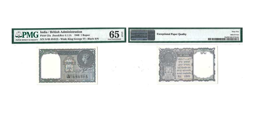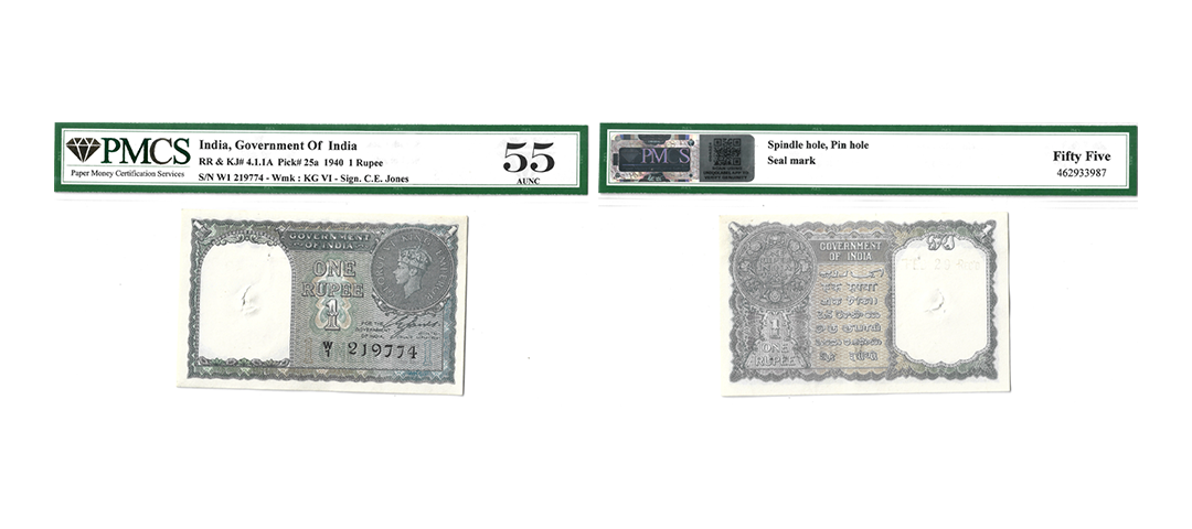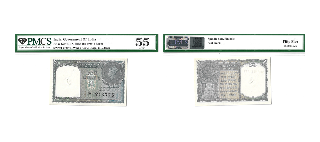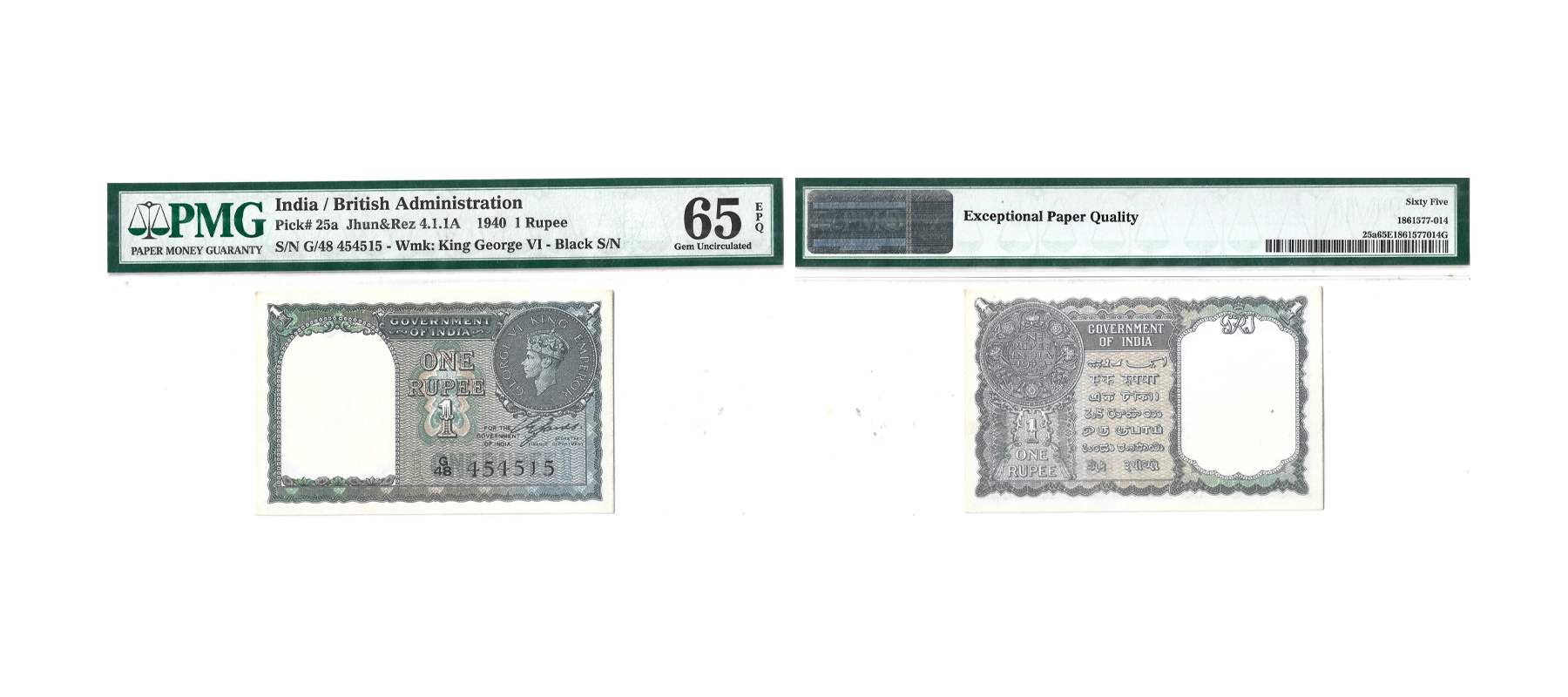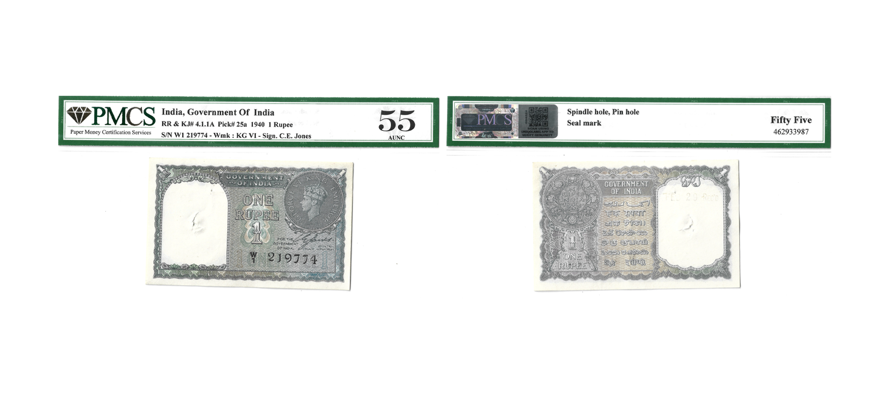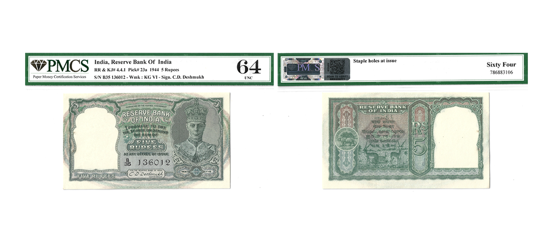 Bank of Madras, 100 Rupees, hand signed, dated 10th June 1859-49 of date format 18_ _, type 2, serial no.: 11774. Obv: BANK OF MADRAS in semi circular on top, above the Vignette of Equestrian statue of Sir Thomas Munroe, Governor of Madras. Denominations in numerals on 4 corners, Bank of Madras written on top 2 panels in English, Persian, Telugu & Tamil and Denominations written on bottom 2 panels in the same 4 languages. Printed Serial 11774 on both halves. Manuscript Signature of Secy. & Treasurer, Robert Hunter. Printed by Perkins, Bacon & Petch, London. Rev: BANK OF MADRAS in big bold fonts and Denomination in big bold words. (J&R 1C.3.1.6.) printer PB&P, Graded by PMG 12 Fine NET. Note: two “CANCELLED” chop marks below each serial numbers, Repaired, Reattached at Center. Never seen earlier as issued notes but only known to exist as Specimen Proofs.