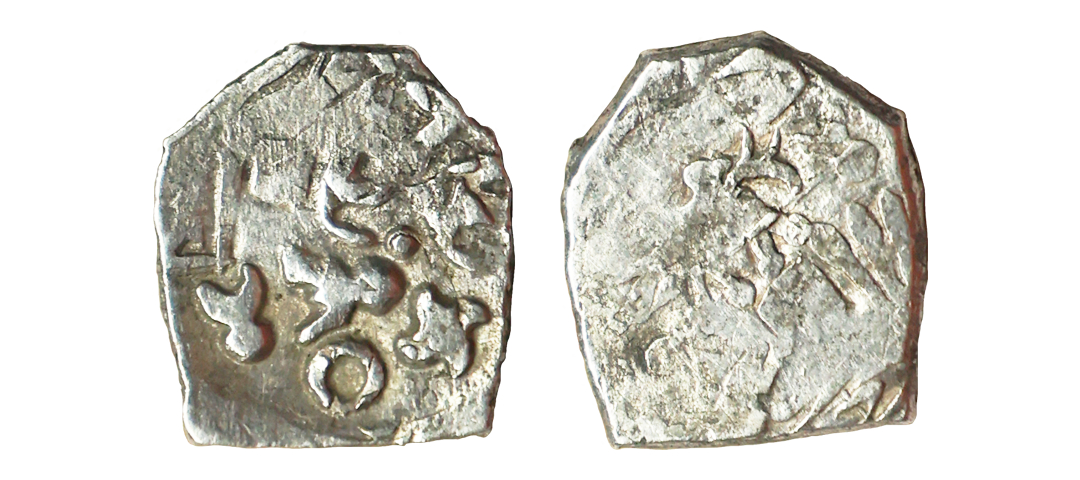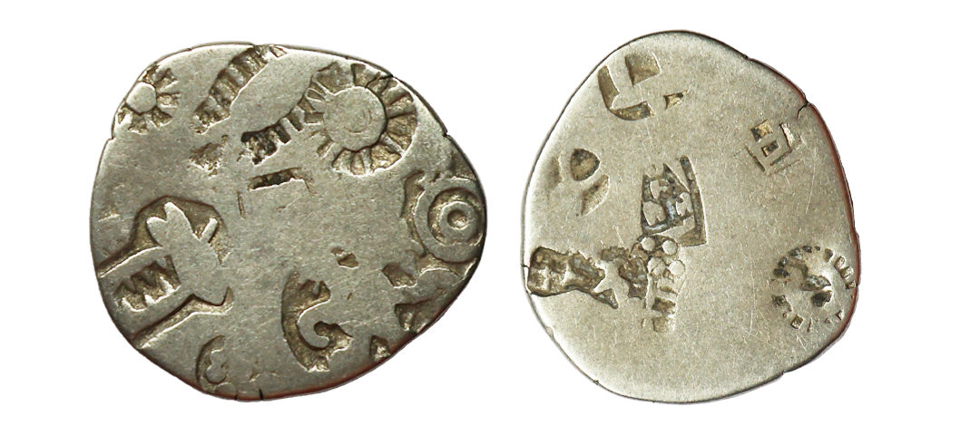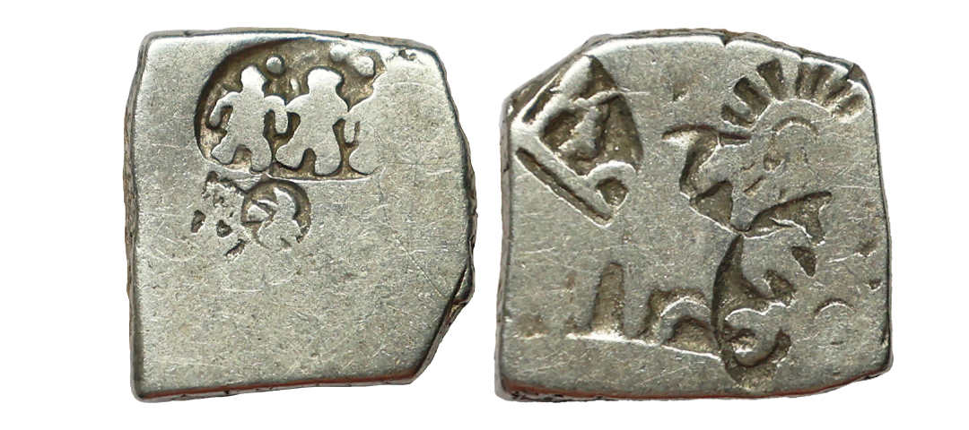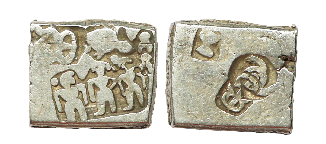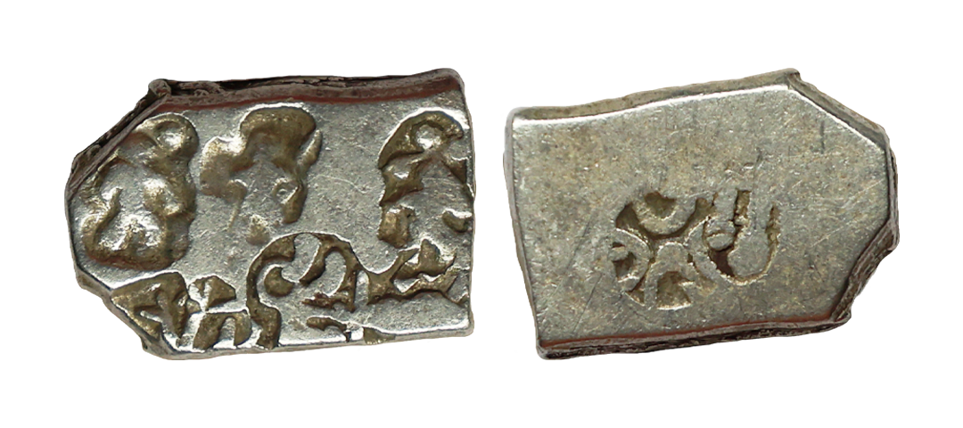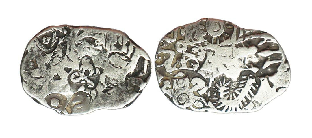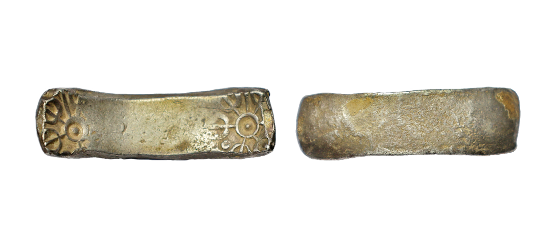 Archaic Coinage, Punch Marked, attributed to Gandhara Mahajanapada (c. 600-400 BC.), Kabul Region, Bent Bar, Silver Shatamana, 11.40g, Obv: Six armed symbol at each end of the bar, Uniface, flat bar variety. (Rajgor # Series 34). Very Fine+.
