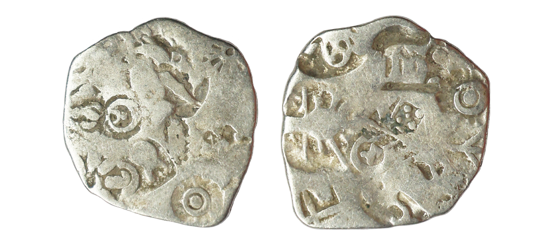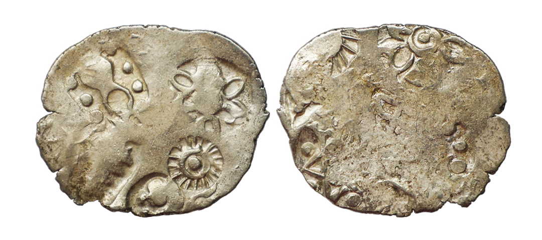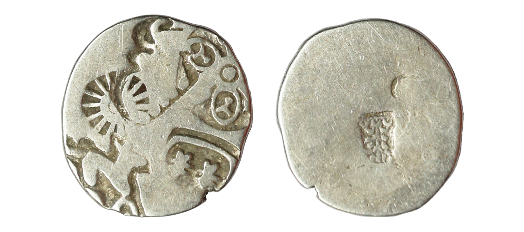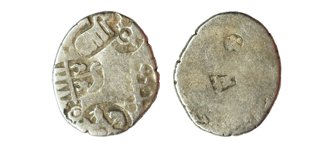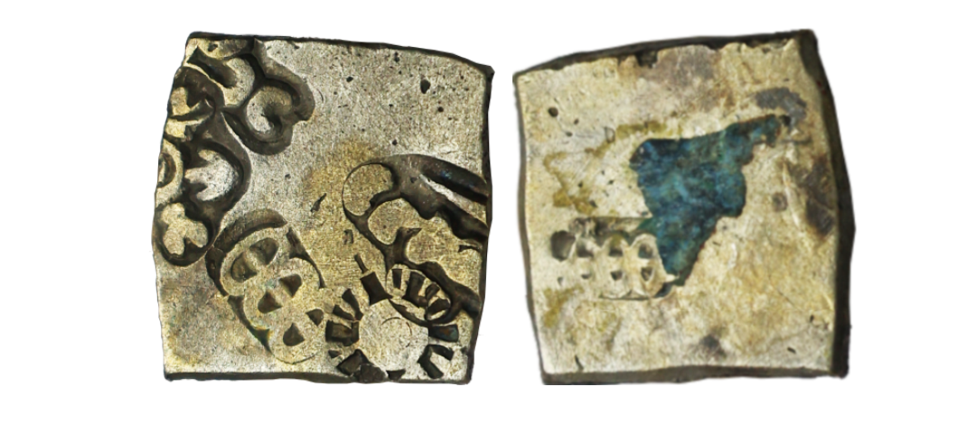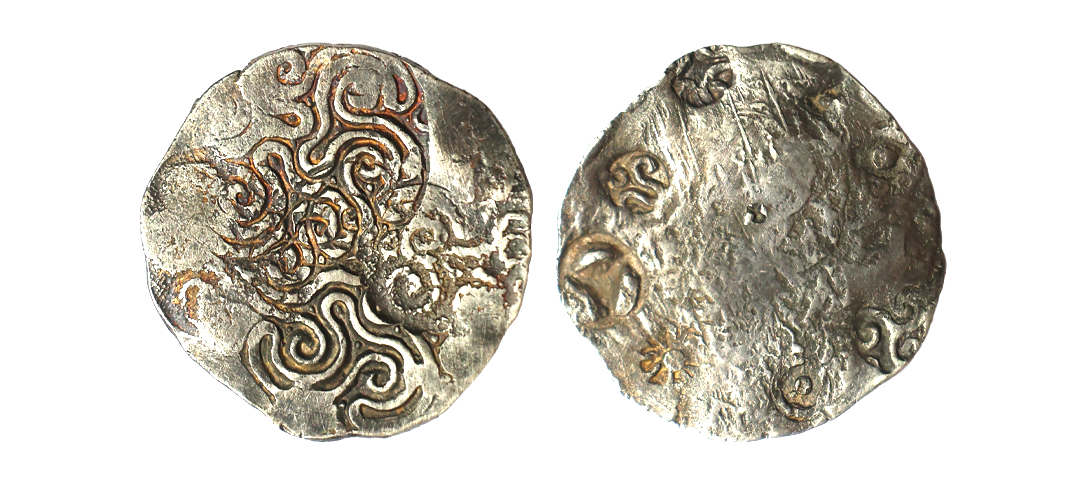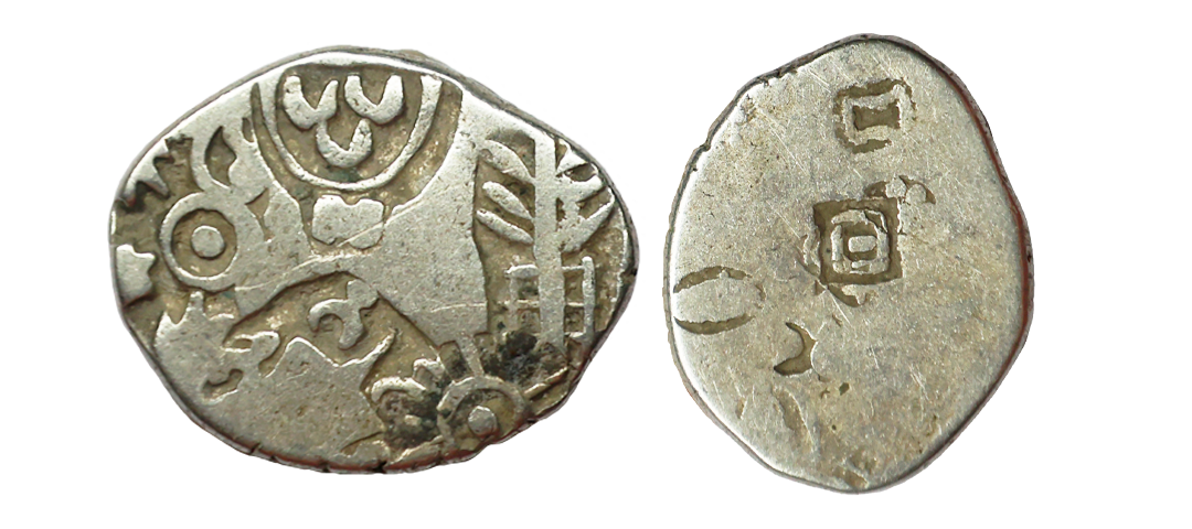 Archaic Coinage, Punch Marked, attributed to Gandhara Mahajanapada (c. 600-400 BC.), Kabul Region, Bent Bar, Silver Shatamana, 11.40g, Obv: Six armed symbol at each end of the bar, Uniface, flat bar variety. (Rajgor # Series 34). Very Fine+.