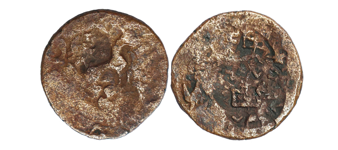Ancient, Taxila, (2nd-1st Century BC), Copper Unit, 0.93 gms, Obv. Two bull/deer facing each other, Rev. 3-arched hill & hollow cross, Pieper #1557, fine, very scarce.