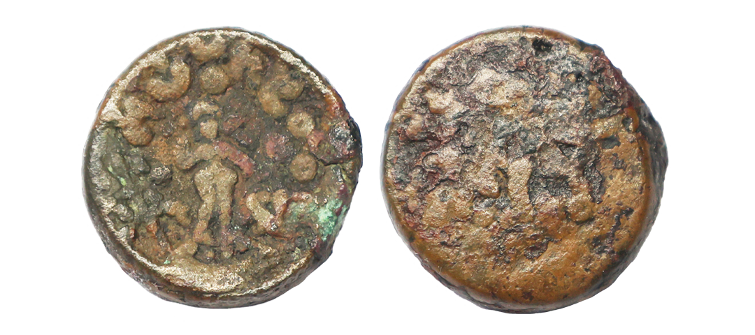 Ancient, Taxila, (2nd-1st Century BC), Copper Unit, 0.93 gms, Obv. Two bull/deer facing each other, Rev. 3-arched hill & hollow cross, Pieper #1557, fine, very scarce.
