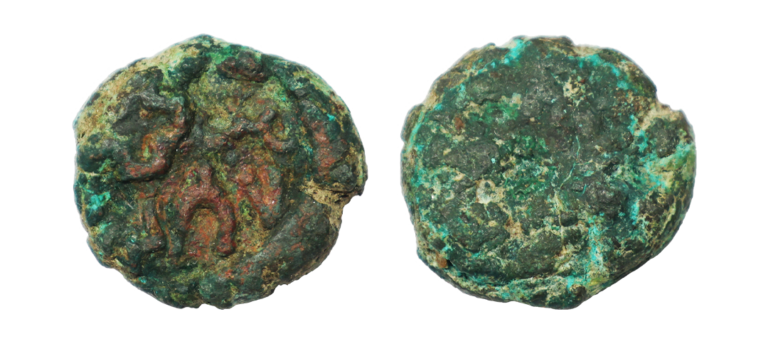 Ancient, Taxila, (2nd-1st Century BC), Copper Unit, 0.93 gms, Obv. Two bull/deer facing each other, Rev. 3-arched hill & hollow cross, Pieper #1557, fine, very scarce.
