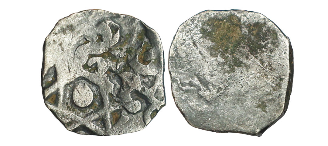 Ancient, Punch Marked Coinage, Eran Region (2nd-1st Century BC), Copper Unit, 7.40 gms, Unlisted, Punches of Ujjain symbol with small swastika betweem each orb, Elephant, & bull River in centre, Uniface, Unlisted combination in Pieper, fine to very fine, very scarce.