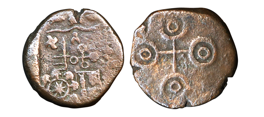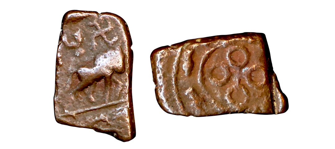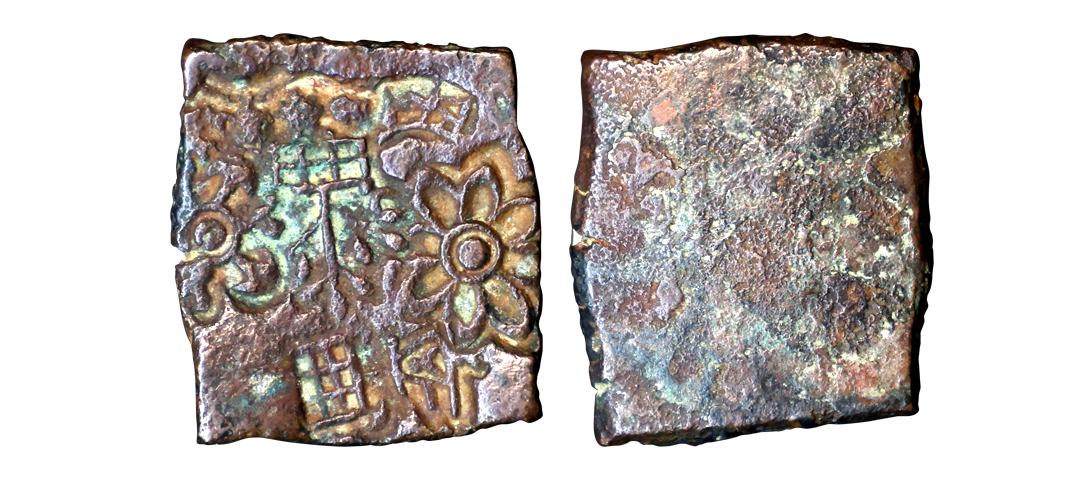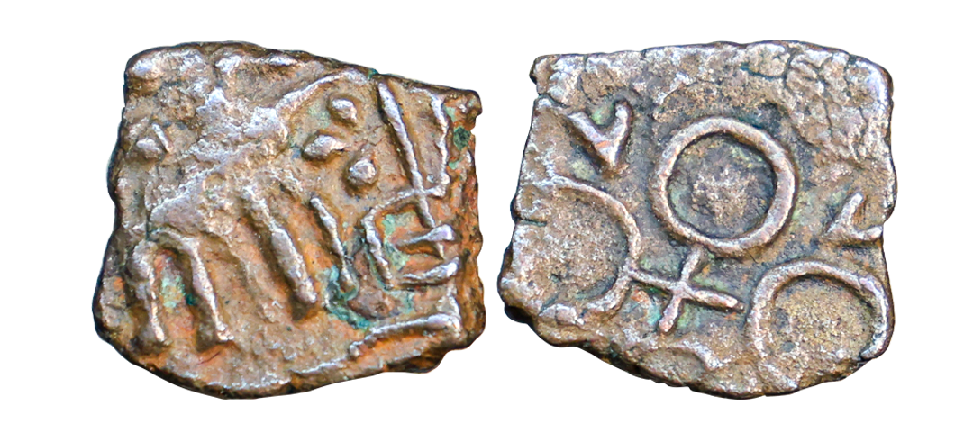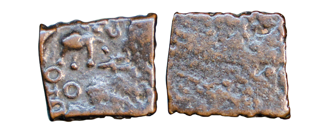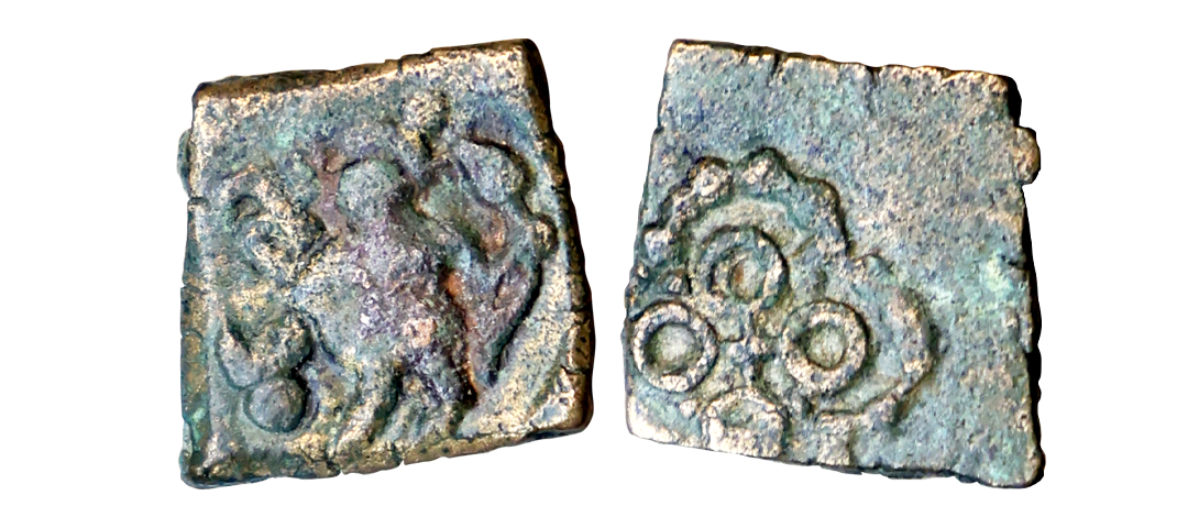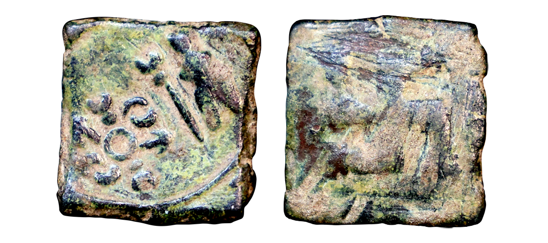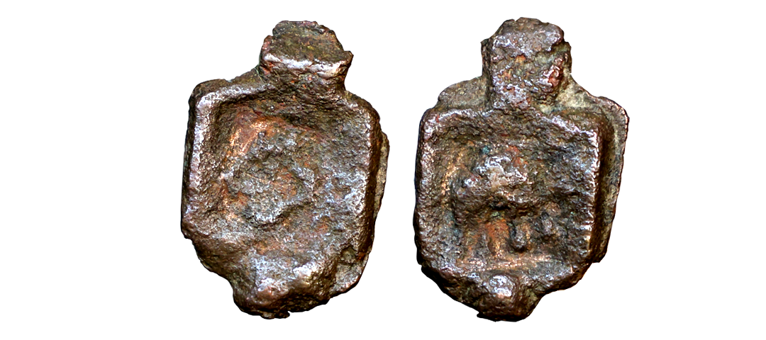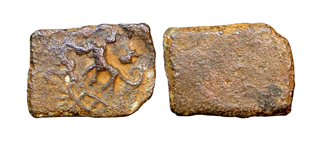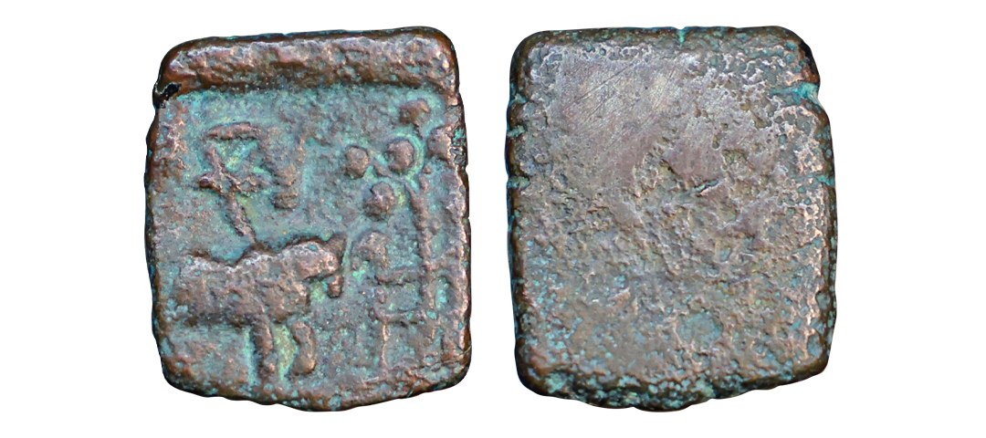 Ujjain (2nd-1st Century BC), Copper Unit, 0.93 gms, Figure (Mahakal or Laxmi) Holding Lotus Flower in Hand and Bold Taurine Symbol, Reverse with Ujjain Symbol, Unlisted Type, very fine+, very rare.
