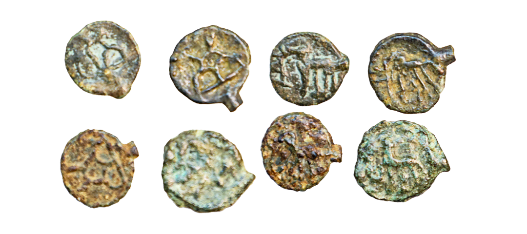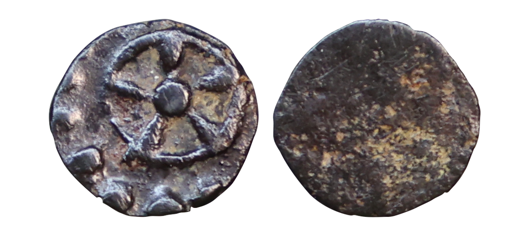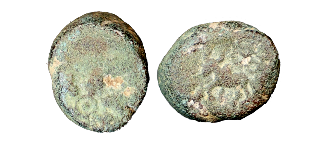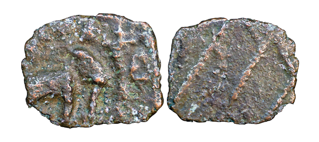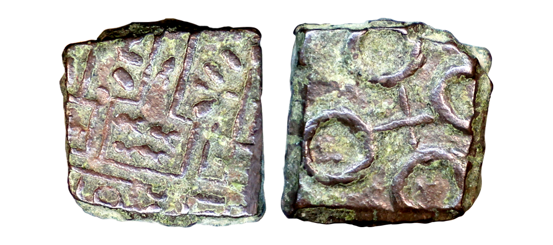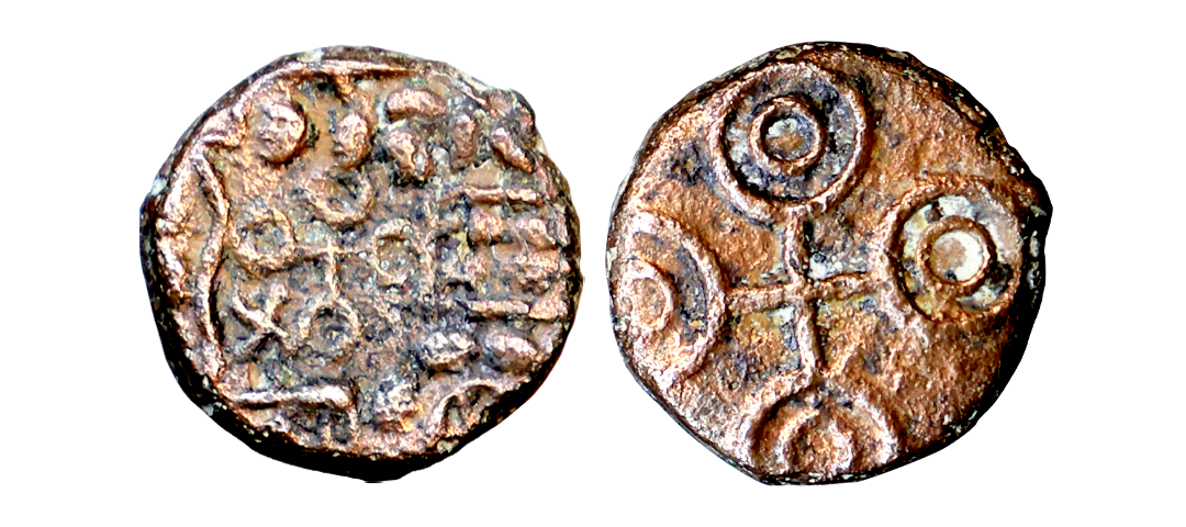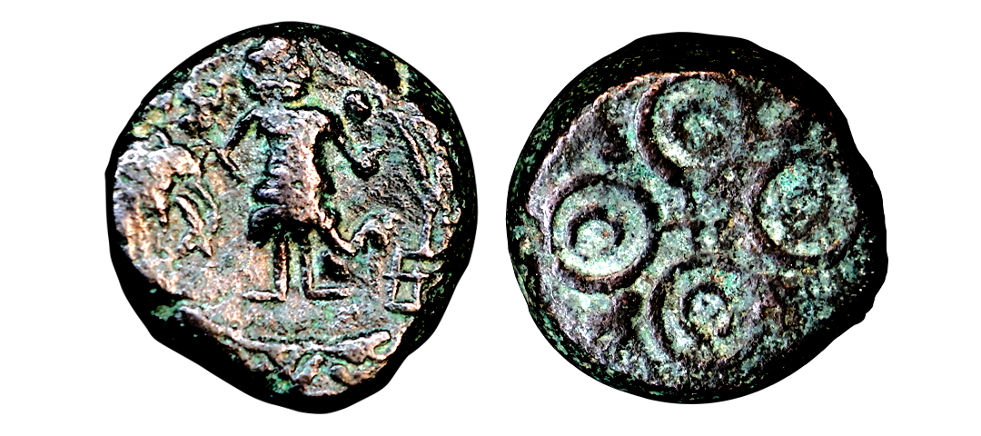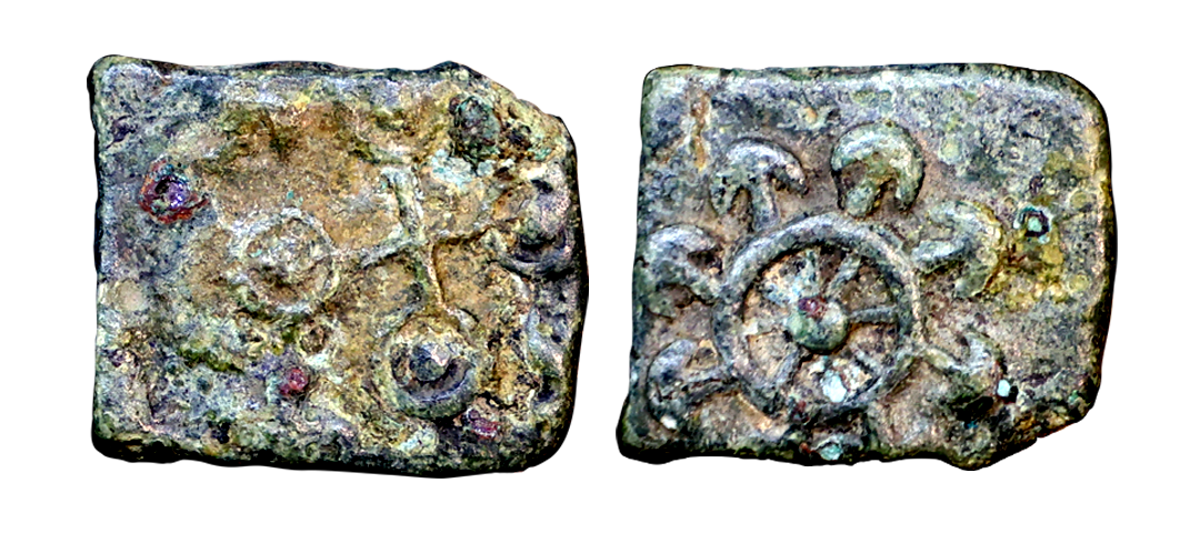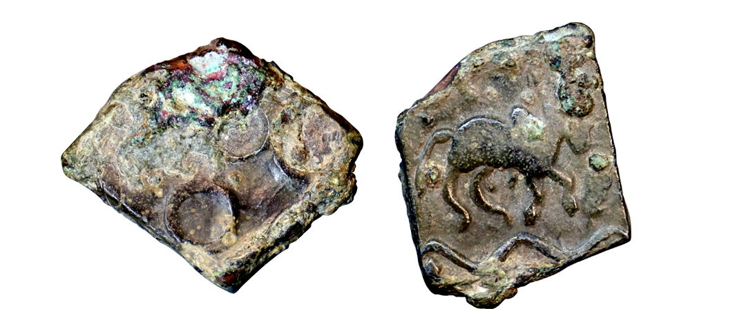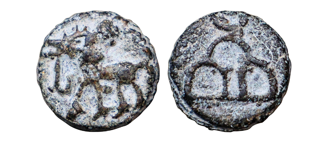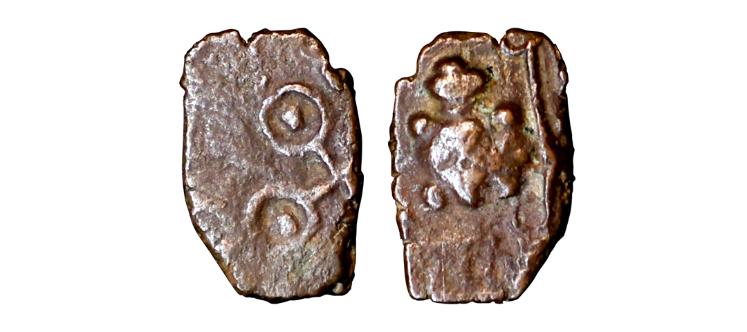 Ujjain (2nd-1st Century BC), Copper Unit, 0.93 gms, Figure (Mahakal or Laxmi) Holding Lotus Flower in Hand and Bold Taurine Symbol, Reverse with Ujjain Symbol, Unlisted Type, very fine+, very rare.