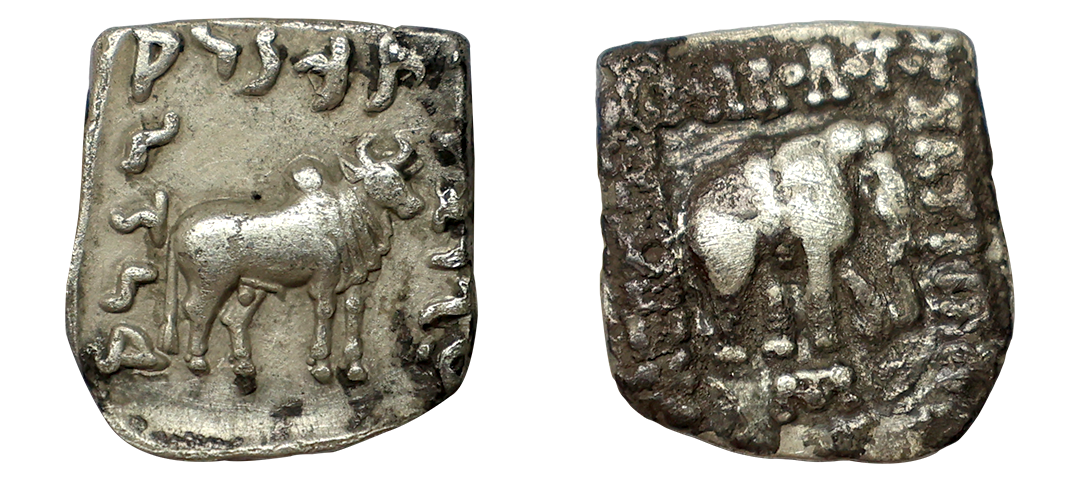 Ancient, Indo-Greeks, Apollodotus I (c. 174-165 BC), Silver Drachma (Indian Standard), 2.35 gms, Obv. Elephant walking right. Monogram below. Greek Legend around ‘BAΣIΛEΩΣ AΠOΛΛOΔOTOY ΣΩTHPOΣ’, Rev. Humped Bull to right. Monogram below.Kharoshthi legend around ‘MaharajasaApaladatasaTratarasa’, about very fine, rare.