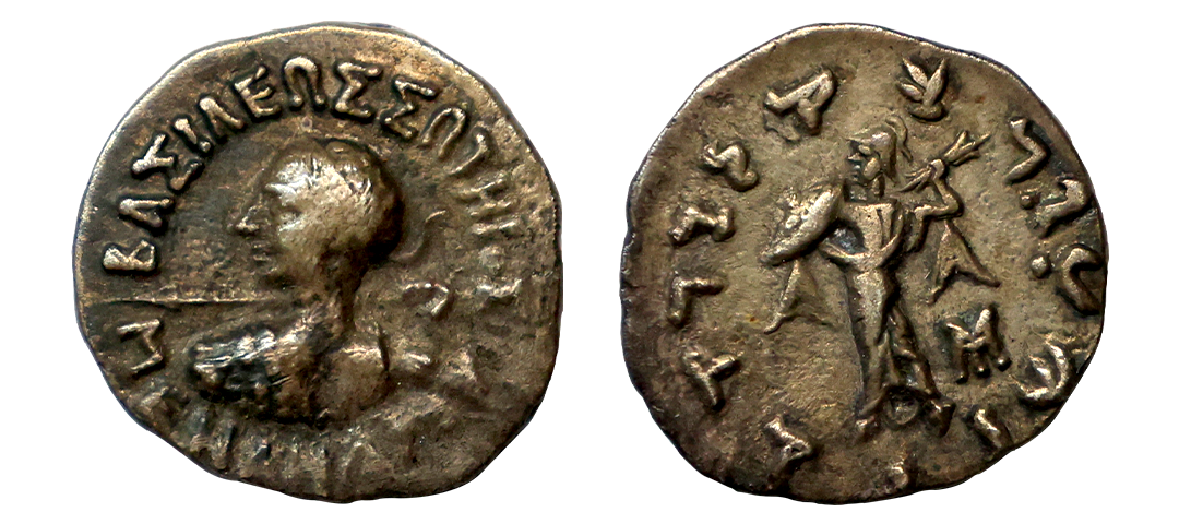 Ancient, Indo-Greeks, Apollodotus I (c. 174-165 BC), Silver Drachma (Indian Standard), 2.35 gms, Obv. Elephant walking right. Monogram below. Greek Legend around ‘BAΣIΛEΩΣ AΠOΛΛOΔOTOY ΣΩTHPOΣ’, Rev. Humped Bull to right. Monogram below.Kharoshthi legend around ‘MaharajasaApaladatasaTratarasa’, about very fine, rare.