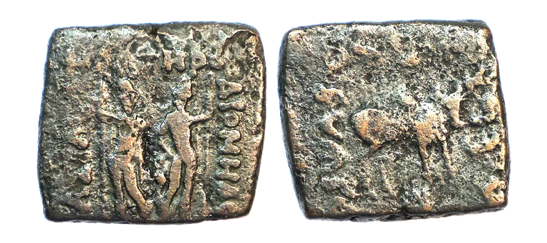 Ancient, Indo-Greeks, Apollodotus I (c. 174-165 BC), Silver Drachma (Indian Standard), 2.35 gms, Obv. Elephant walking right. Monogram below. Greek Legend around ‘BAΣIΛEΩΣ AΠOΛΛOΔOTOY ΣΩTHPOΣ’, Rev. Humped Bull to right. Monogram below.Kharoshthi legend around ‘MaharajasaApaladatasaTratarasa’, about very fine, rare.