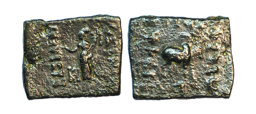 Ancient, Indo-Greeks, Apollodotus I (c. 174-165 BC), Silver Drachma (Indian Standard), 2.35 gms, Obv. Elephant walking right. Monogram below. Greek Legend around ‘BAΣIΛEΩΣ AΠOΛΛOΔOTOY ΣΩTHPOΣ’, Rev. Humped Bull to right. Monogram below.Kharoshthi legend around ‘MaharajasaApaladatasaTratarasa’, about very fine, rare.