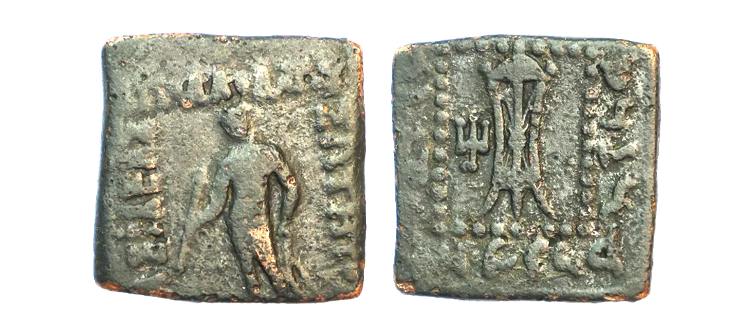 Ancient, Indo-Greeks, Apollodotus I (c. 174-165 BC), Silver Drachma (Indian Standard), 2.35 gms, Obv. Elephant walking right. Monogram below. Greek Legend around ‘BAΣIΛEΩΣ AΠOΛΛOΔOTOY ΣΩTHPOΣ’, Rev. Humped Bull to right. Monogram below.Kharoshthi legend around ‘MaharajasaApaladatasaTratarasa’, about very fine, rare.