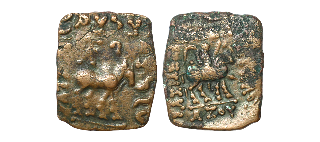Ancient, Indo-Greeks, Apollodotus I (c. 174-165 BC), Silver Drachma (Indian Standard), 2.35 gms, Obv. Elephant walking right. Monogram below. Greek Legend around ‘BAΣIΛEΩΣ AΠOΛΛOΔOTOY ΣΩTHPOΣ’, Rev. Humped Bull to right. Monogram below.Kharoshthi legend around ‘MaharajasaApaladatasaTratarasa’, about very fine, rare.