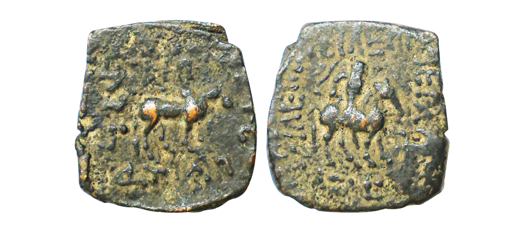 Ancient, Indo-Greeks, Apollodotus I (c. 174-165 BC), Silver Drachma (Indian Standard), 2.35 gms, Obv. Elephant walking right. Monogram below. Greek Legend around ‘BAΣIΛEΩΣ AΠOΛΛOΔOTOY ΣΩTHPOΣ’, Rev. Humped Bull to right. Monogram below.Kharoshthi legend around ‘MaharajasaApaladatasaTratarasa’, about very fine, rare.