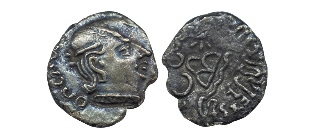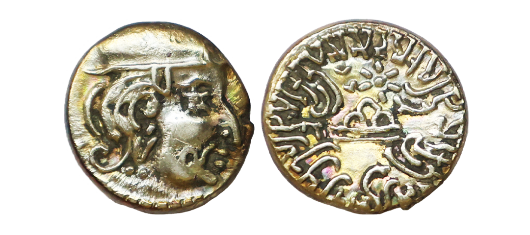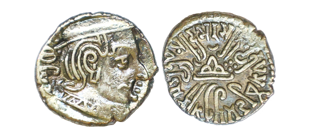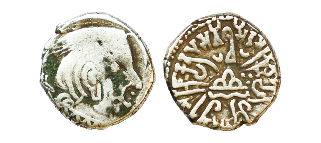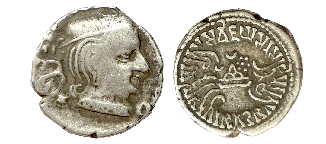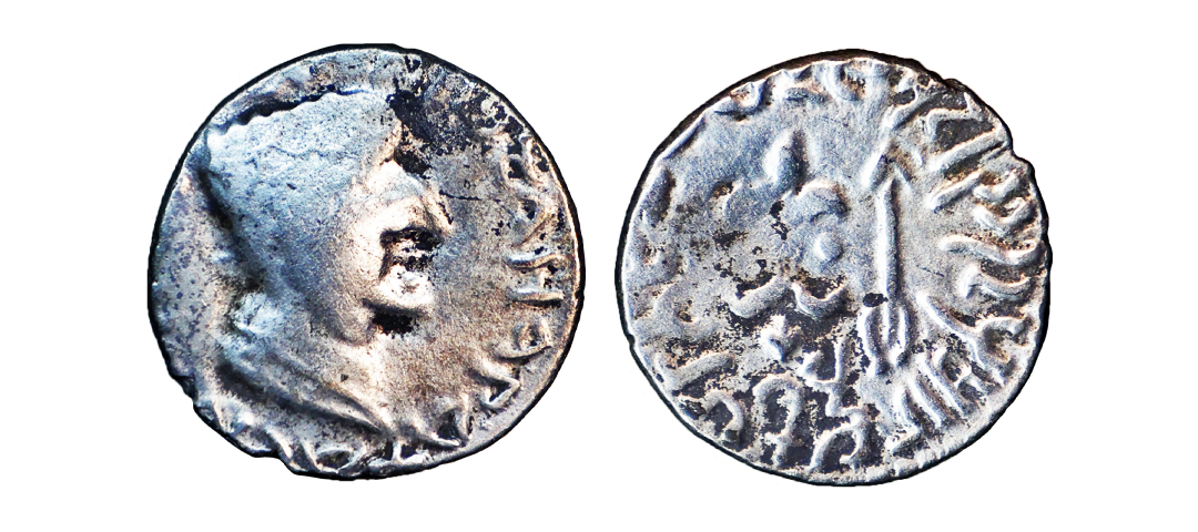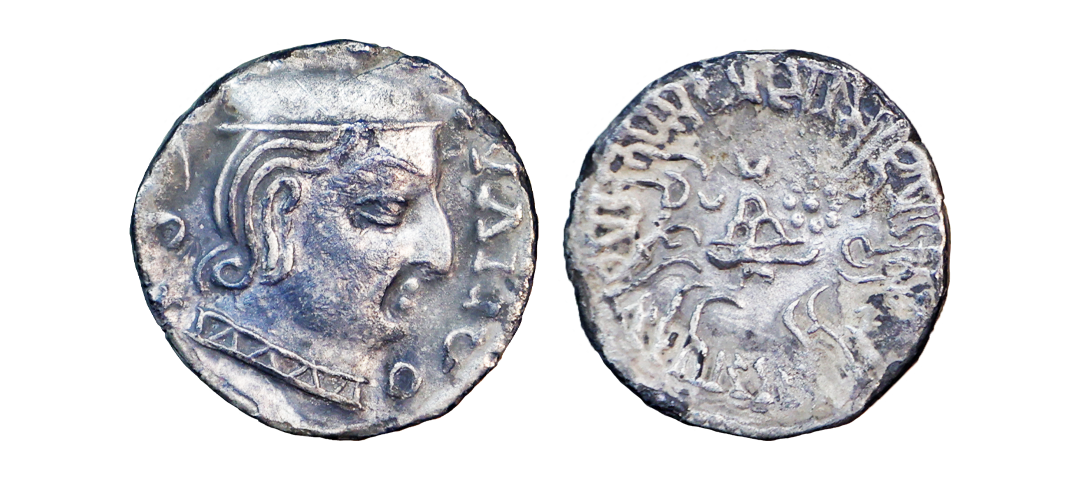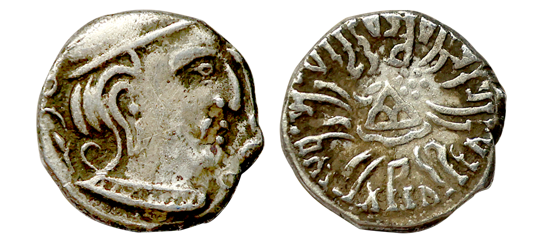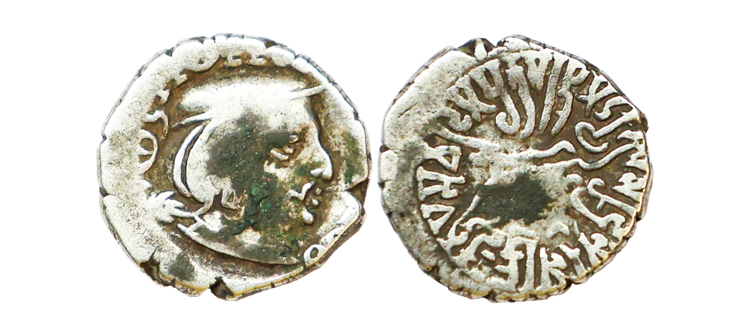 Ancient, Western Kshatrapas, Kardamaka Family, Vijayasena son of Damasena (238-239 AD), Silver Dramma, 2.05 gms, Obv. Bust of king facing right, corrupt Greek legend around, Rev. Three-arch-hill(Chaitya) in center flanked by Sun and Moon, Brahmi legend around reading ‘Rajno Mahakshatrapasa Damasenaputrasa Rajno Mahakshatrapasa Vijayasenasa’, Dotted border around, Fishman # 23, very fine, rare with full legend visible.