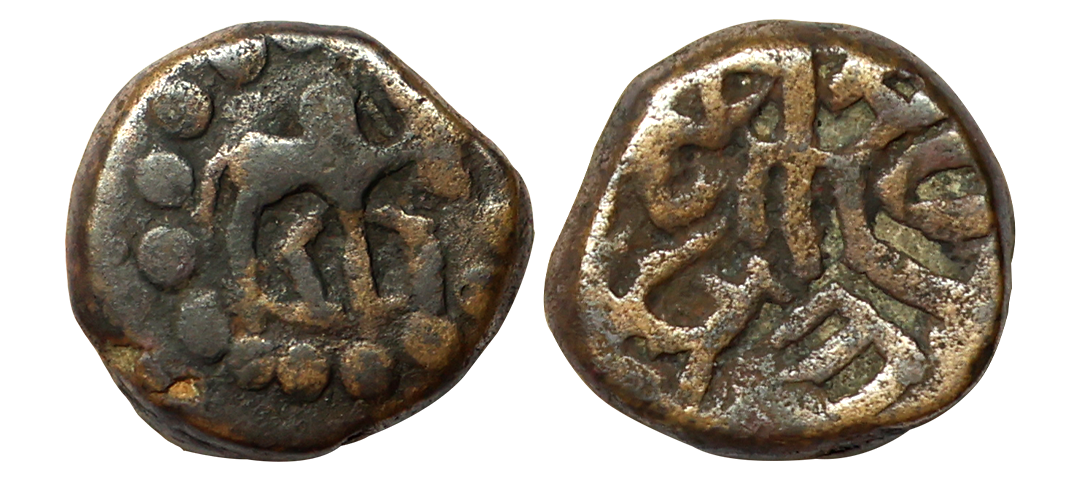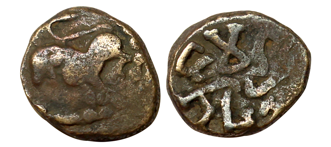 Pre Satavahanas, Vidarbha Region Damabhadra (2nd Century BC), Copper Unit, 2.05g, Obv. bull to right with legends 'DaMaBhaDraSa' in brahmi, rabbit in circle above, ujjaini symbol, fish and other symbols in field, Rev. blank, completely inscribed coin, Pieper #2410, extremely fine for the type, very rare.