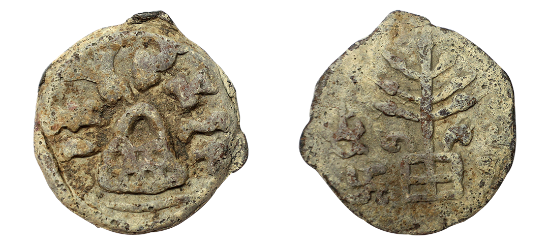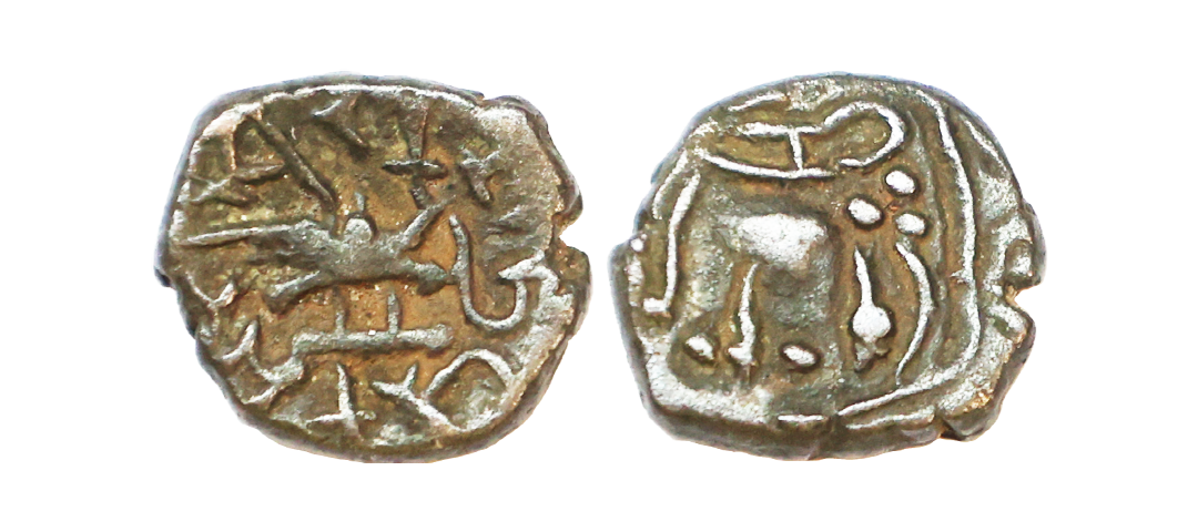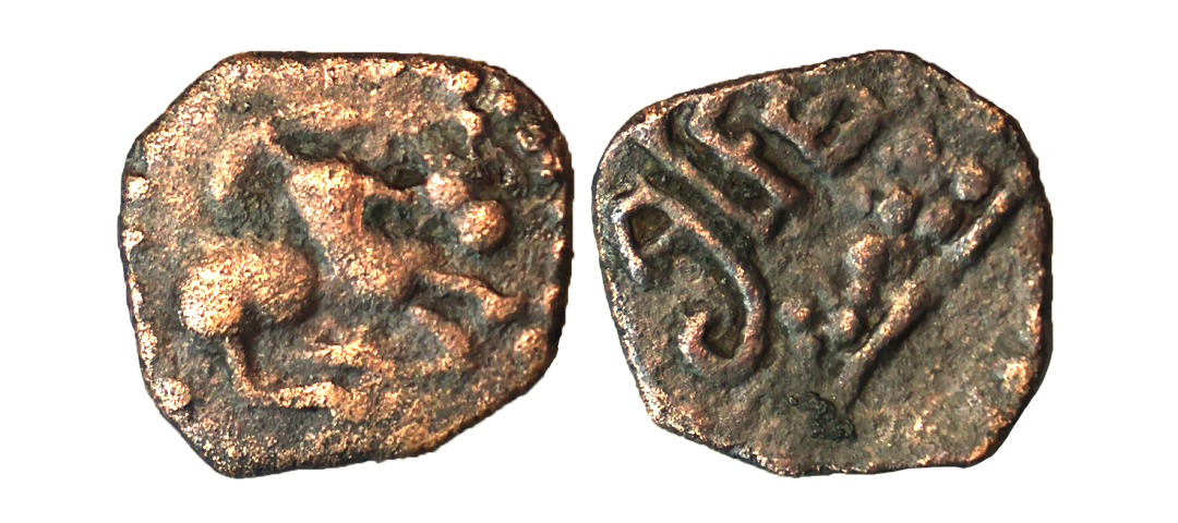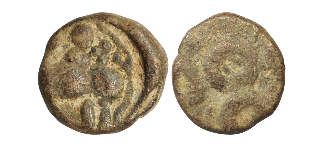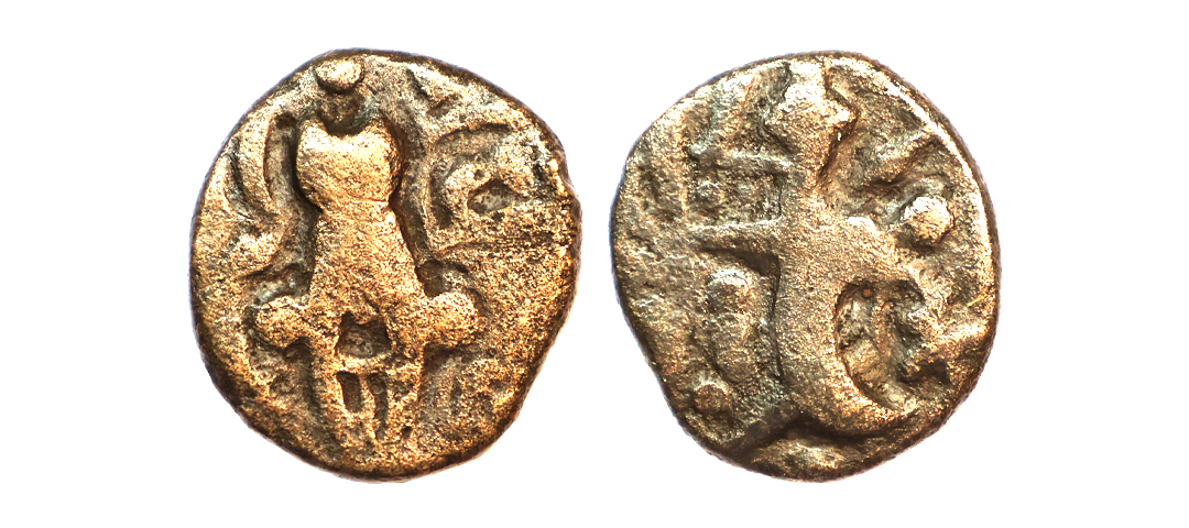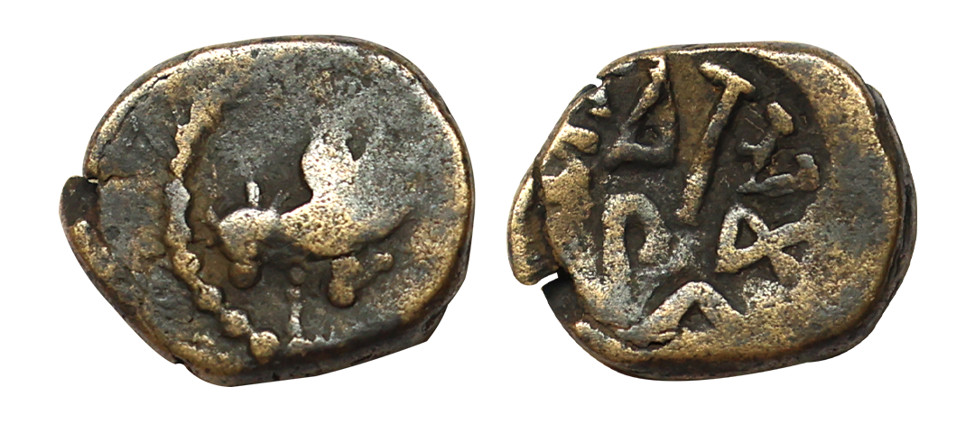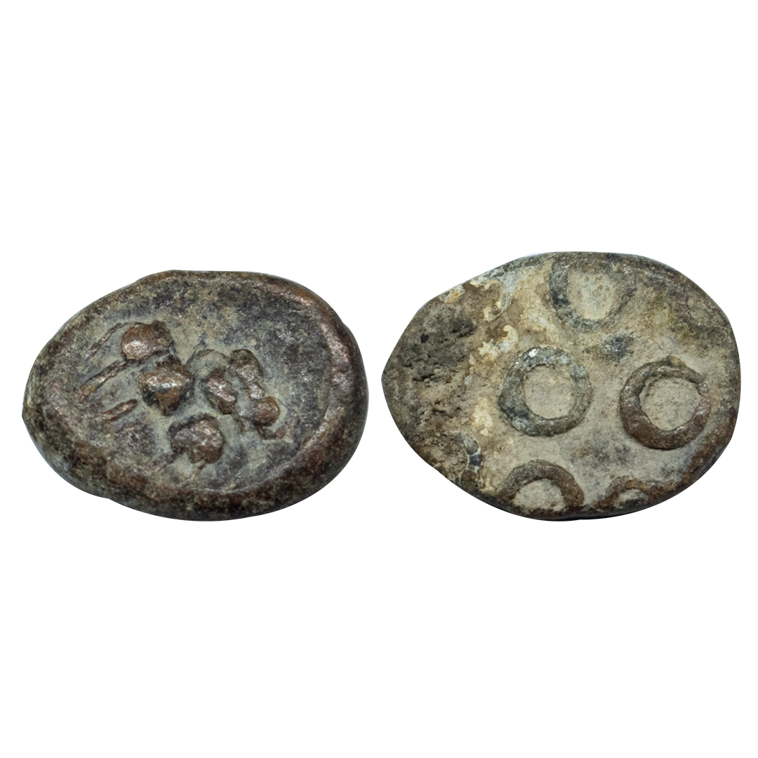 Anandas of Banavasi (300-345 AD), Anonymous Type, Potin Unit, 0.93 gms, traces crude legends with bull to right, Rev. traces distorted bow & arrow with circles, very fine for the type, scarce.