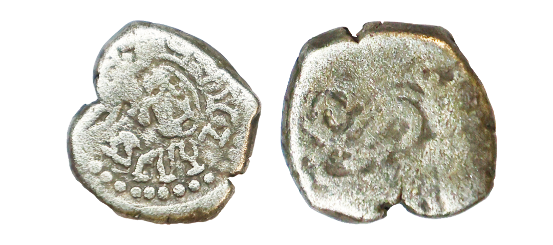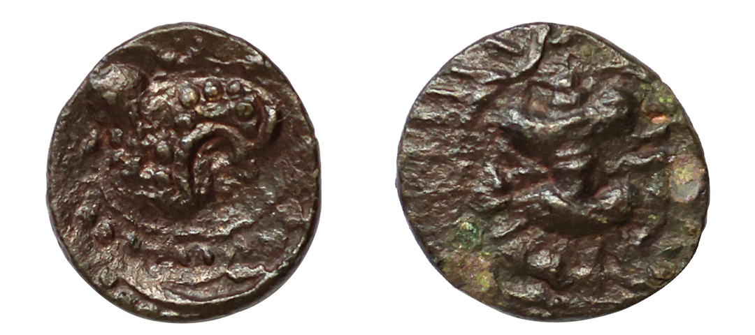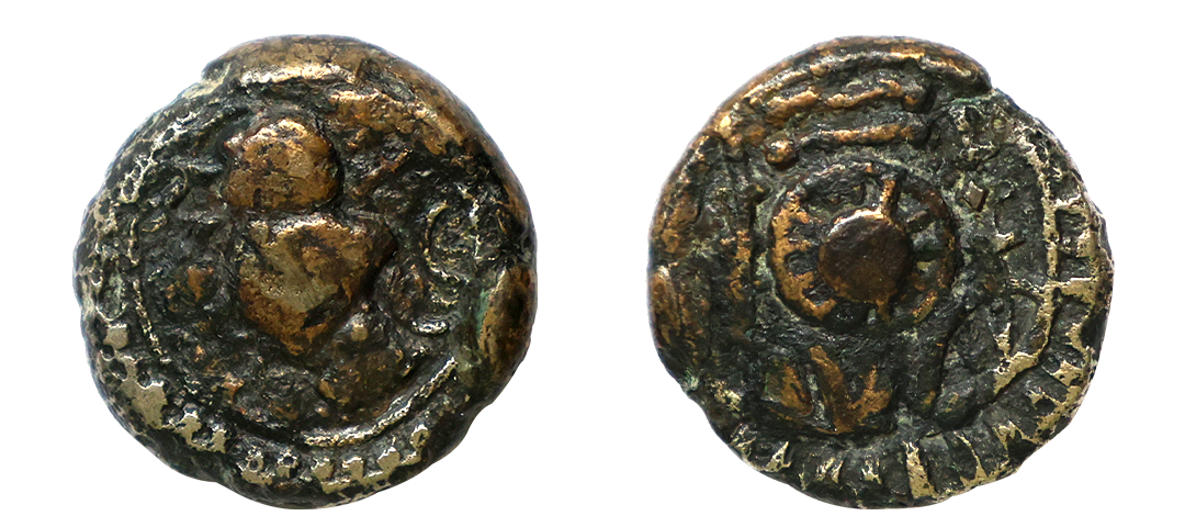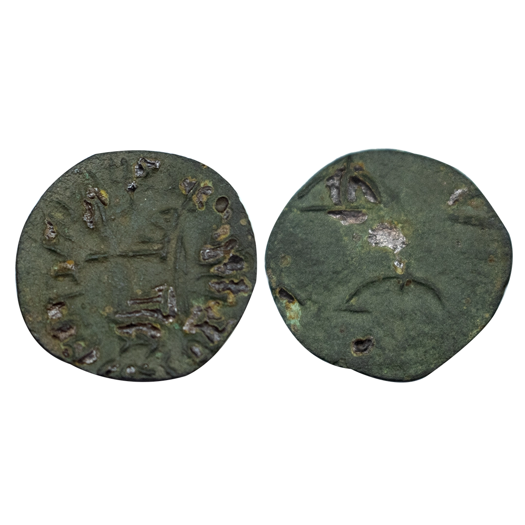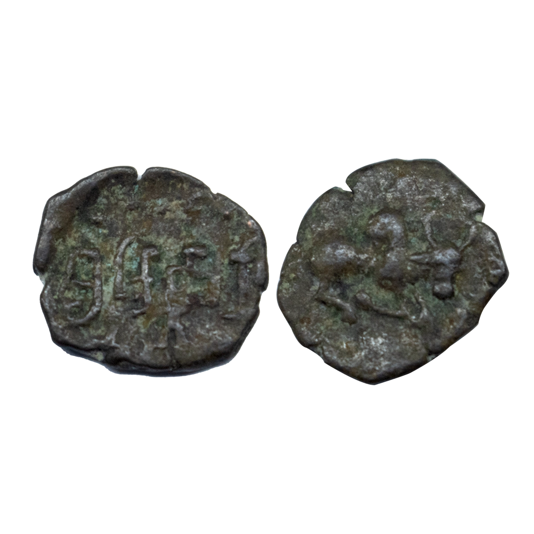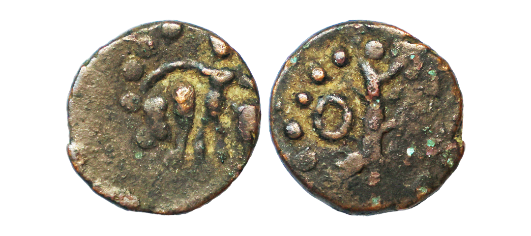 Anandas of Banavasi (300-345 AD), Anonymous Type, Potin Unit, 0.93 gms, traces crude legends with bull to right, Rev. traces distorted bow & arrow with circles, very fine for the type, scarce.