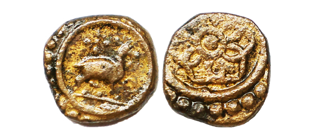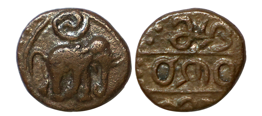 Hindu Medieval, Chalukyas of Gujarat, Ranahasti (10th-11th Century AD), Silver Dramma, 0.50 gms, Obv. Elephant to right within a dotted border, Rev. Devanagari legend in two lines "ShriRana/ (ha)sti" within a dotted border, Fishman # U8, very fine, scarce.