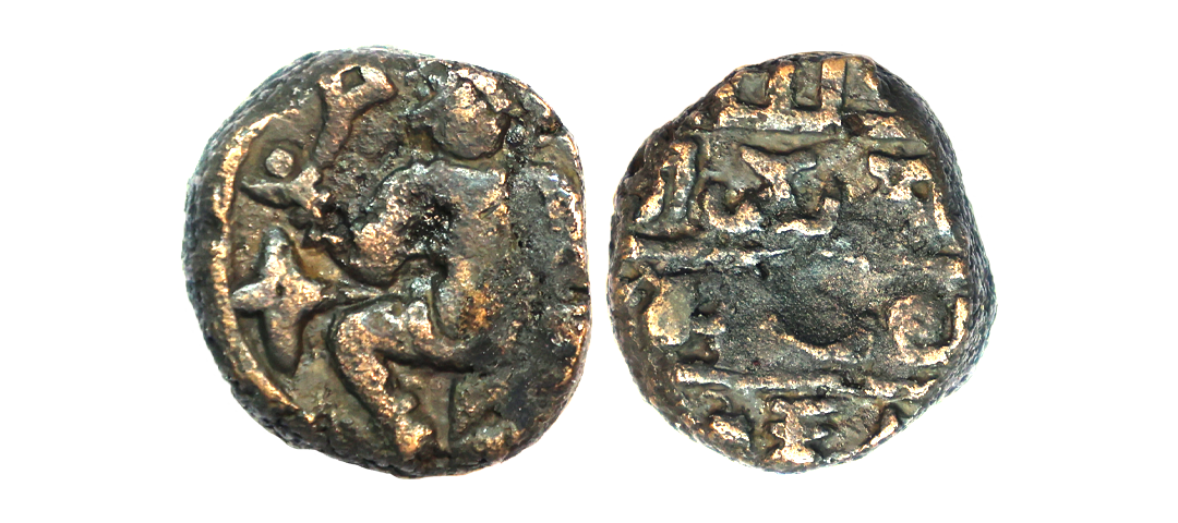 Delhi Sultan, Nasir al-Din Muhammad Qubacha (647-658, 1249-1259) Billon Jital, 3.59 gms, Obv. Horse left and Arabic inscription Rev. Nagari inscription, Album #1819, very fine, very scarce.