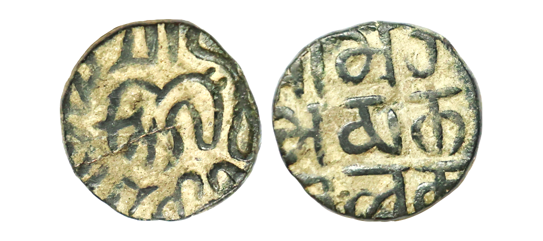 Delhi Sultanate, Muizz al-Din Kaiqubad (AH 686-689, 1287-1290 AD), Billon Three Gani, 3.63 gms, Hazrat Dehli Mint, Obverse on the coin reads, ‘Al-sultan al-a’zam mu’izz al-dunya wa’l din, Reverse on the coin reads. ‘Kaiqubad in Arabic sri sultan mu’izuddin in Nagari, G&G # D183, very fine, scarce.