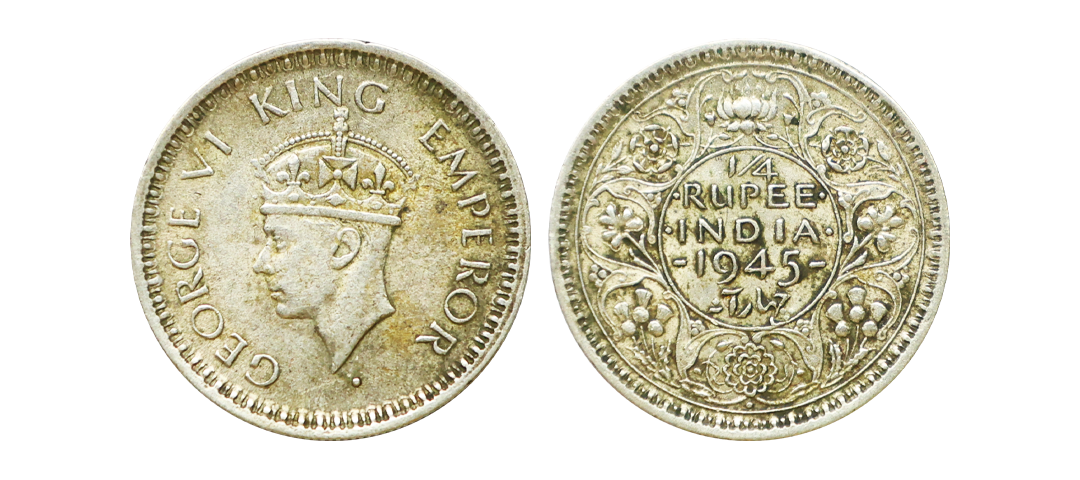 George VI King, 52% Silver 1/4 Rupee, 1945, Bombay Mint, Large "5", Extra Fine.