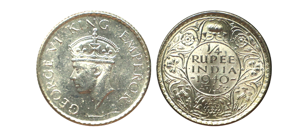 George VI King, 52% Silver 1/4 Rupee, 1945, Bombay Mint, Large "5", Extra Fine.