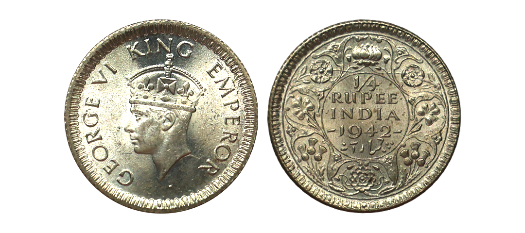 George VI King, 52% Silver 1/4 Rupee, 1945, Bombay Mint, Large "5", Extra Fine.