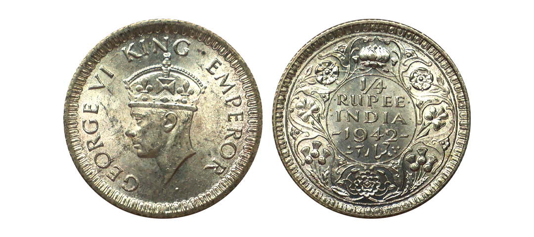 George VI King, 52% Silver 1/4 Rupee, 1945, Bombay Mint, Large "5", Extra Fine.