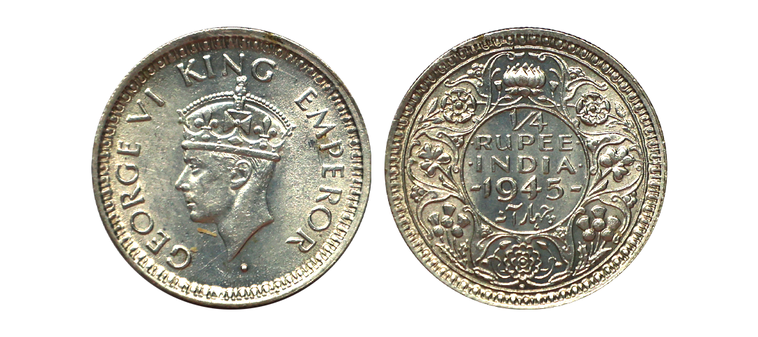 George VI King, 52% Silver 1/4 Rupee, 1945, Bombay Mint, Large "5", Extra Fine.