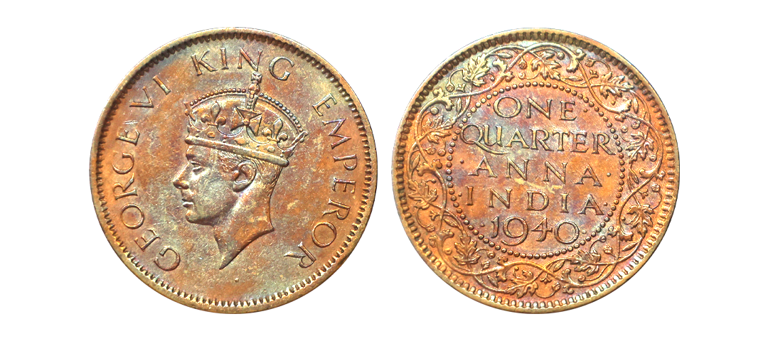 George VI King, 52% Silver 1/4 Rupee, 1945, Bombay Mint, Large "5", Extra Fine.