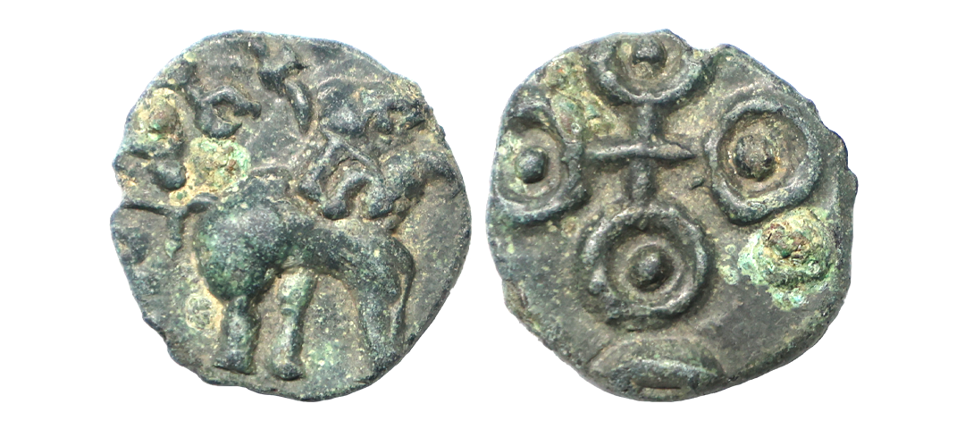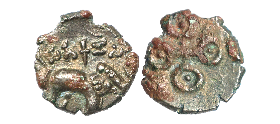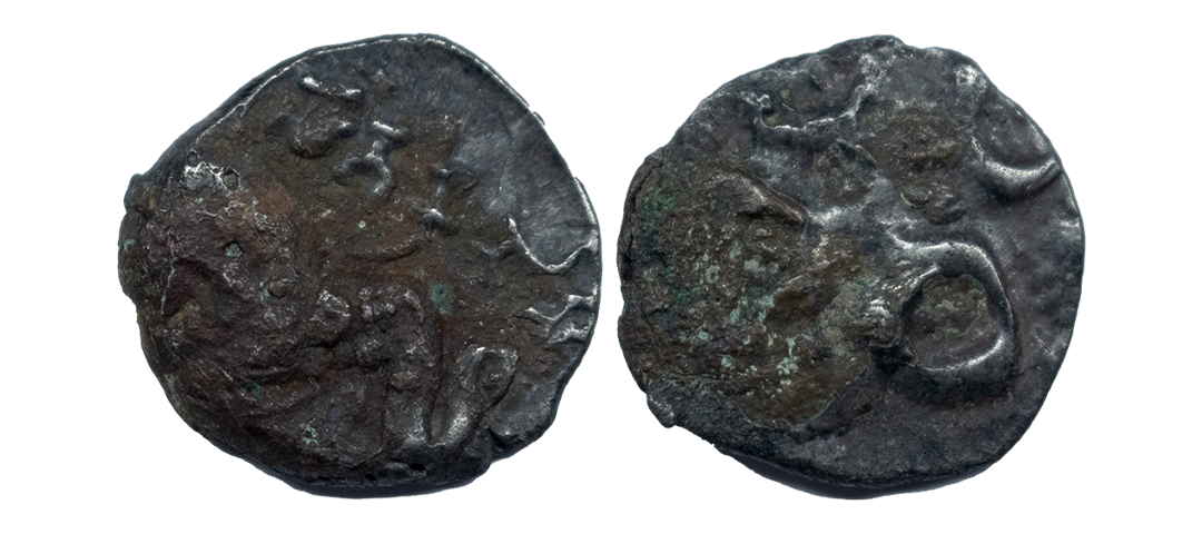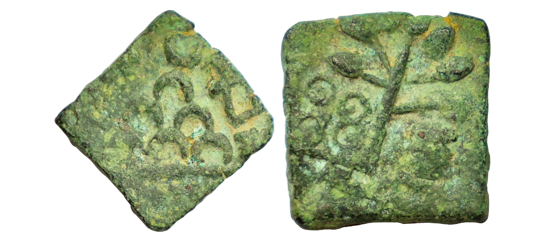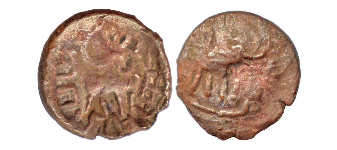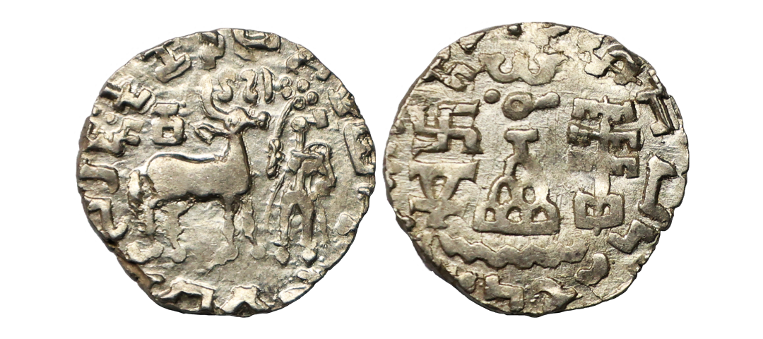 Satavahana, Gautamputra Satakarni overstruck on Nahapana’s Drachm, 2.28 gms, Obv. Thre arched hill overstruck on nahapanas portrait, Rev. Ujjaini symbol on nahapana’s reverse, very fine, rare.