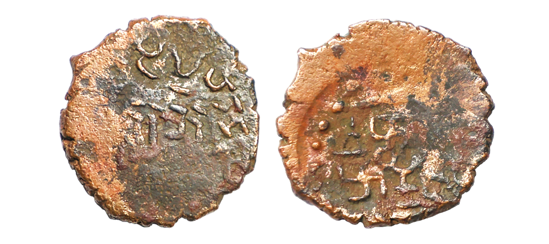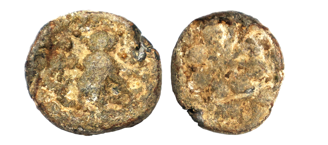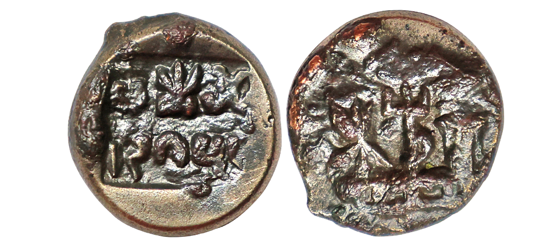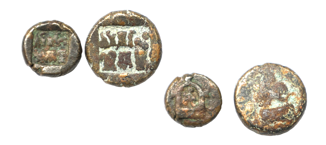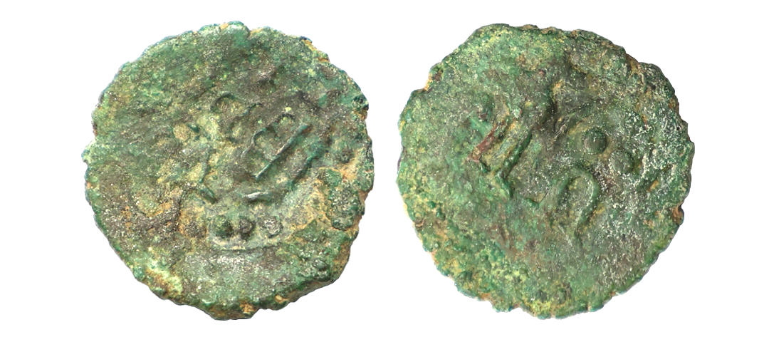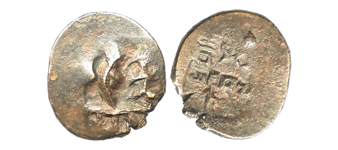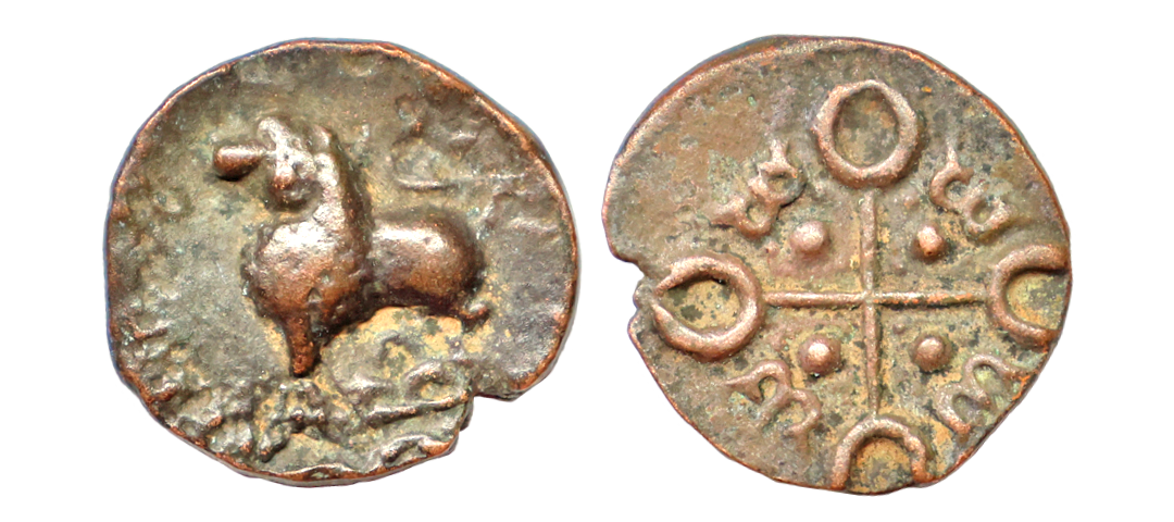 Satavahana, Gautamputra Satakarni overstruck on Nahapana’s Drachm, 2.28 gms, Obv. Thre arched hill overstruck on nahapanas portrait, Rev. Ujjaini symbol on nahapana’s reverse, very fine, rare.