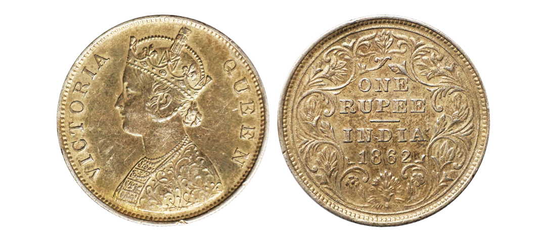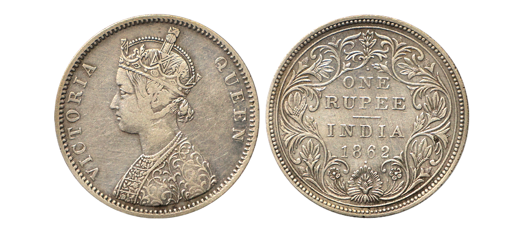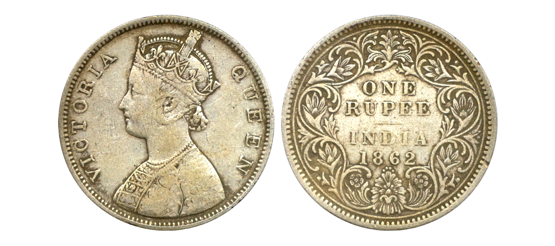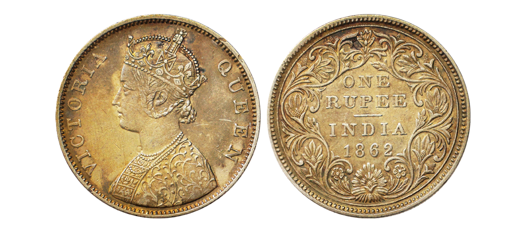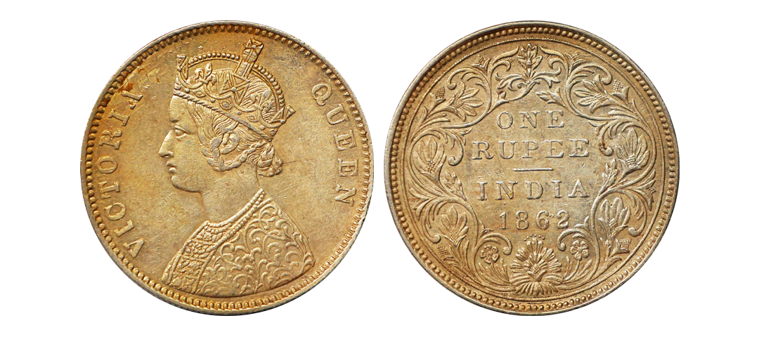 Victoria Queen, 1862, Silver Rupee, B/II, pointed tips of bottom flower ornate, Numeral '2' in '1862' is reengraved on earlier digit, Very Rare.