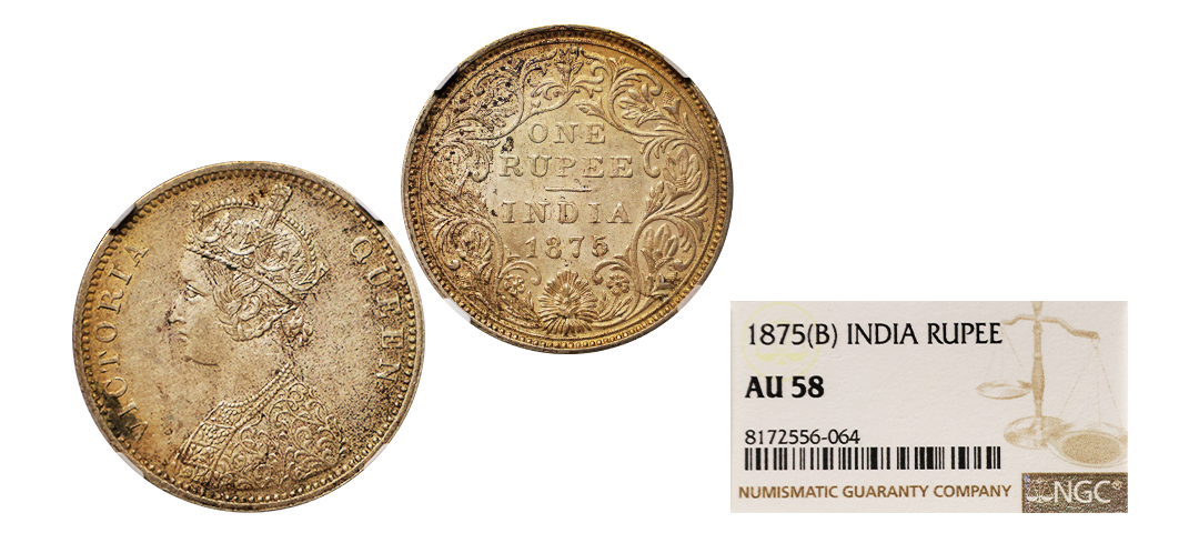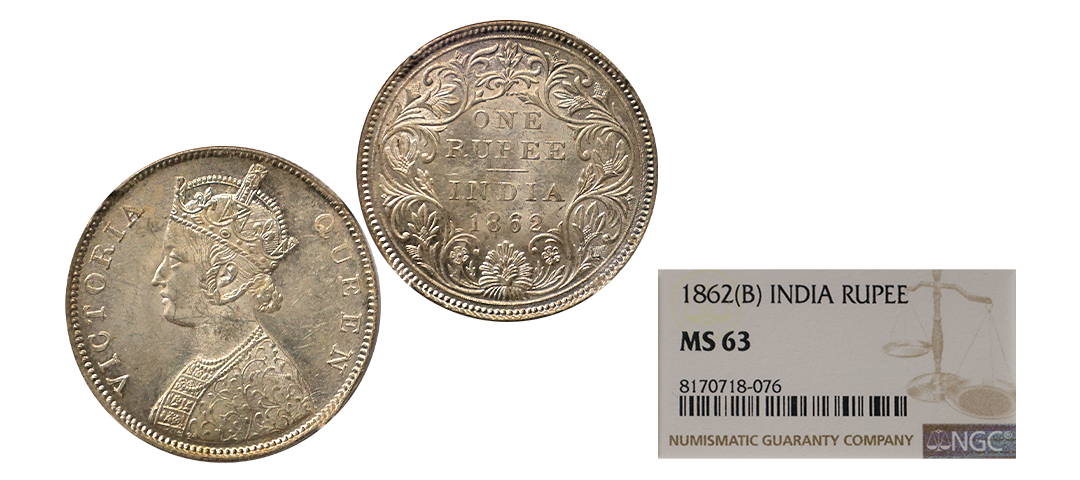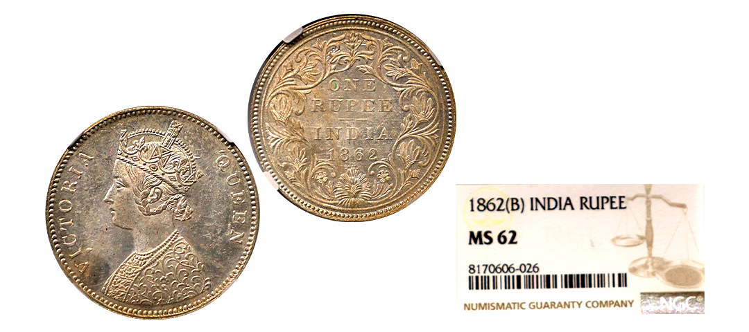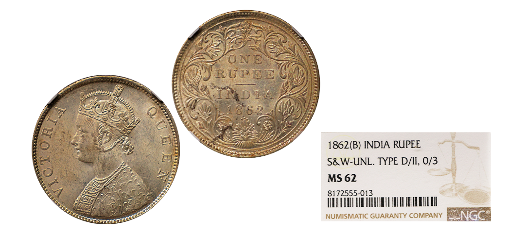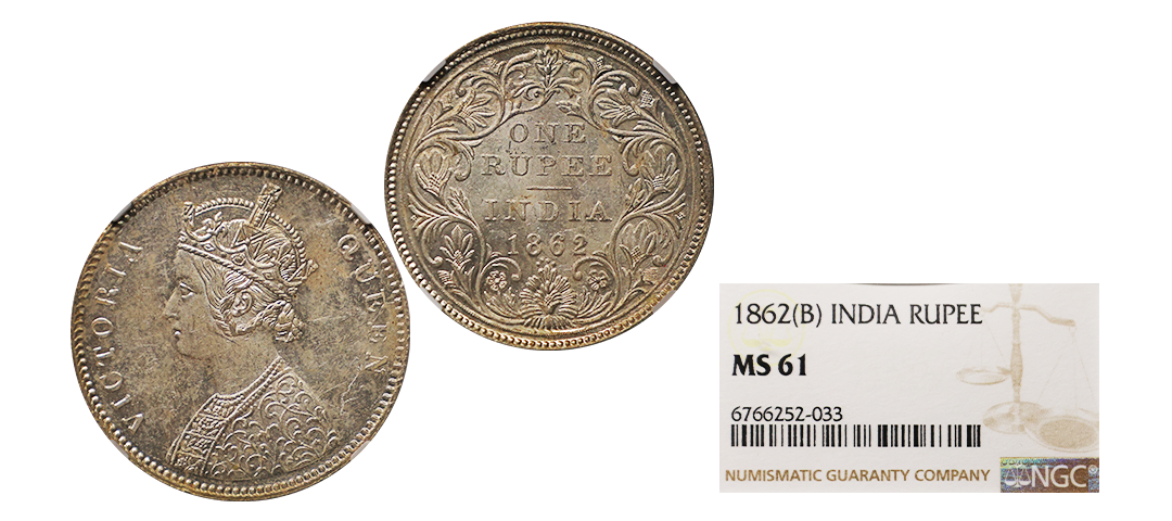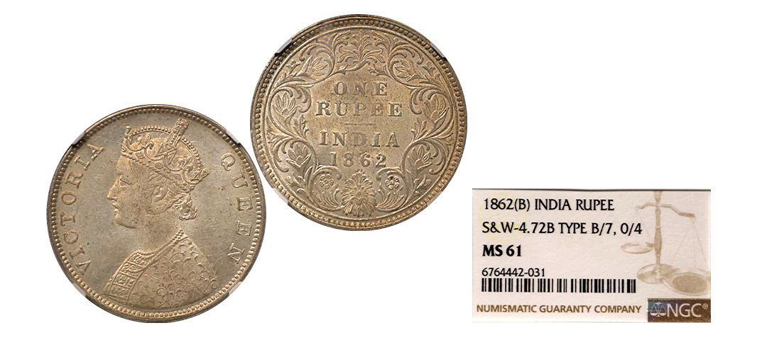 Victoria Queen, 1862, Silver Rupee, B/VII, 0/4 DOTS, Graded by NGC as MS61, extremely rare to get this variety in MS grade.
