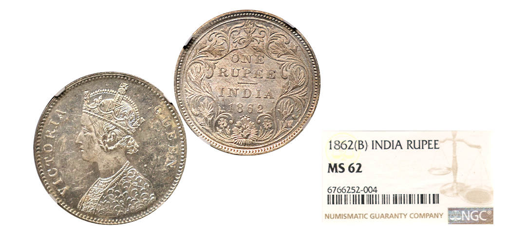 Victoria Queen, 1862, Silver Rupee, A/II, 0/4 DOTS, Superb trike with shining surfaces, Graded by NGC as MS61, Very rare.