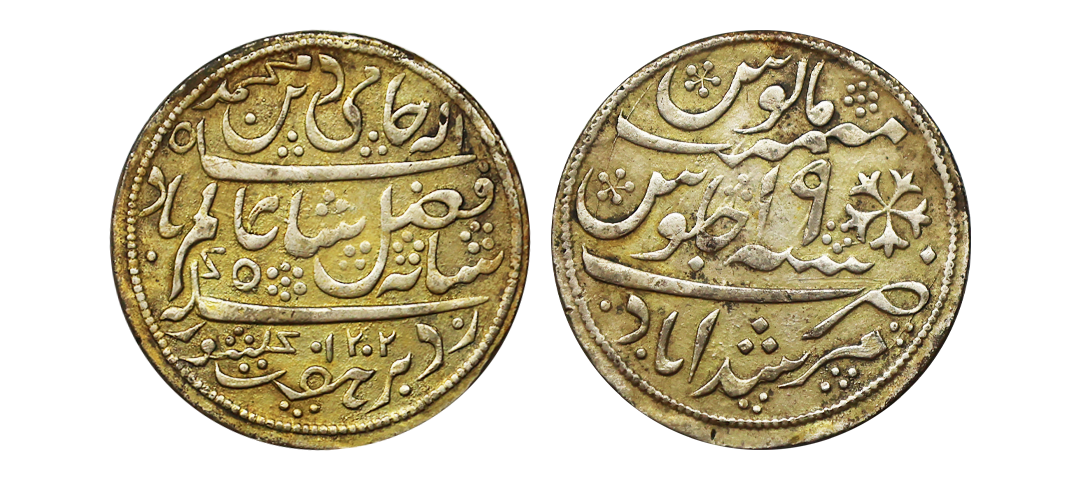 Gold Token, 13.48 gms, Imitating Jahangir Gold Portrait Mohur, Obv. radiate Jahangir cross-legged left on ornate throne against patterned cushion holding flower or gobletd, legends around, Rev. central radiate sun within pelleted quadrate border with upper and lower lines extending to create additional side panels, TOKEN, extremely fine.