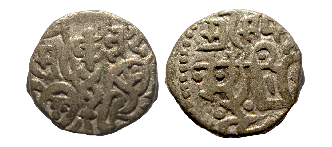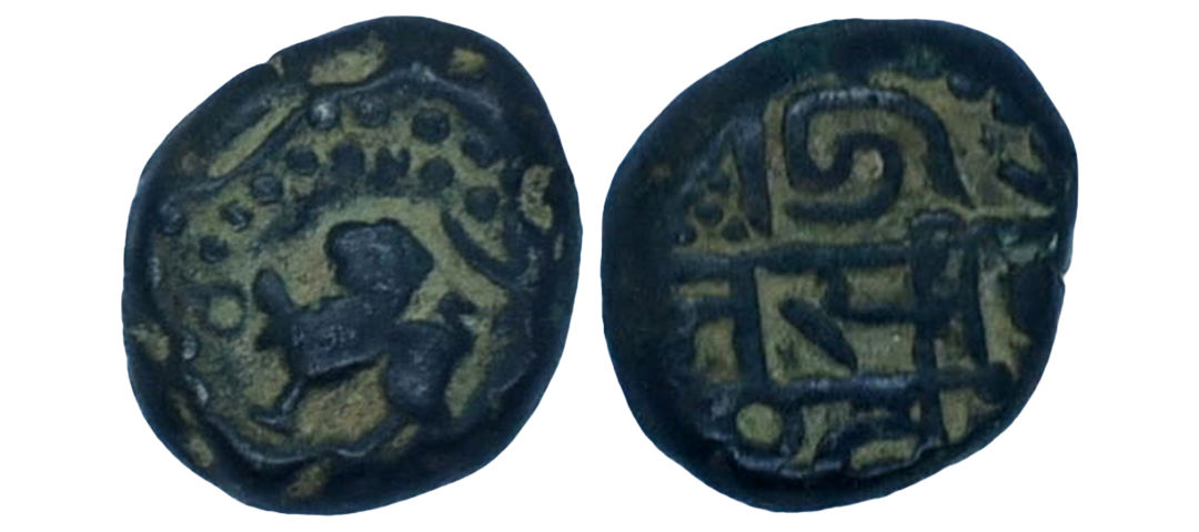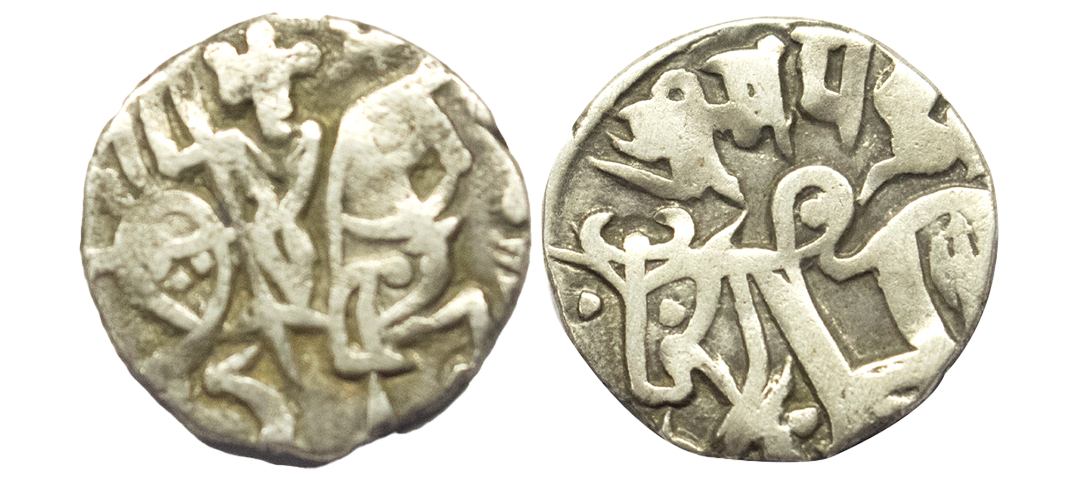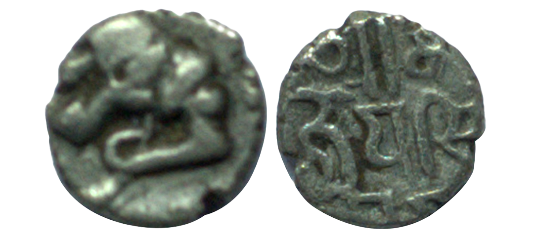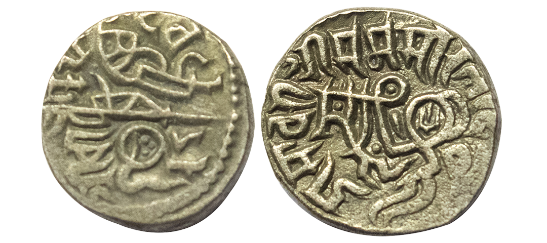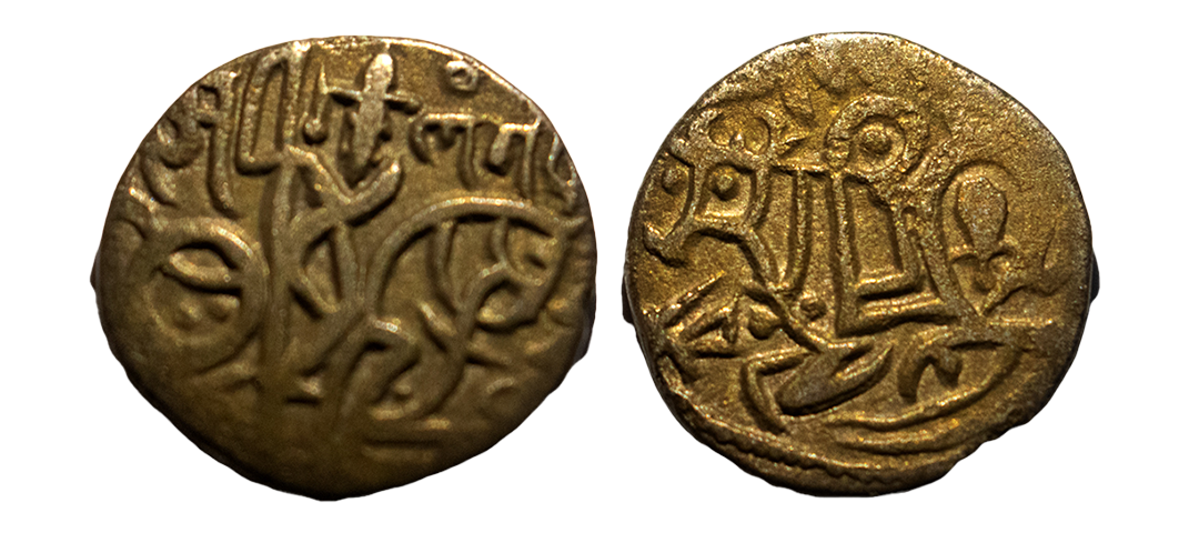 Medieval India, Vijaynagar Kingdom, Harihara II, (c. 1377-1404 AD), Gold 1/2 Varaha, 1.72Grms, OBV: Vishnu seated in padmasana with his wife Lakshmi sitting on his left, Vishnu is holding discus and conch, Rev: Nagari legend in three lines ?Sri Pra tapa hari [hara]. (K Ganesh # 26).
