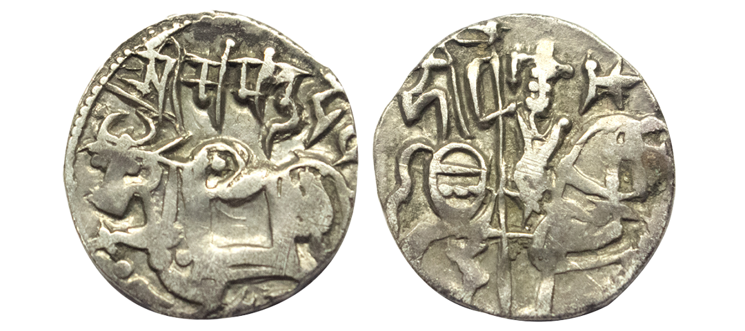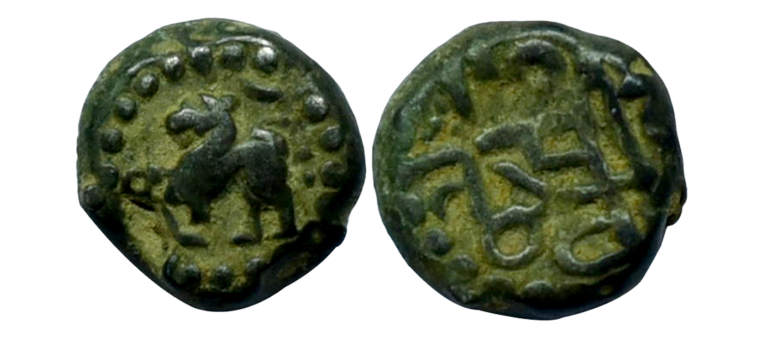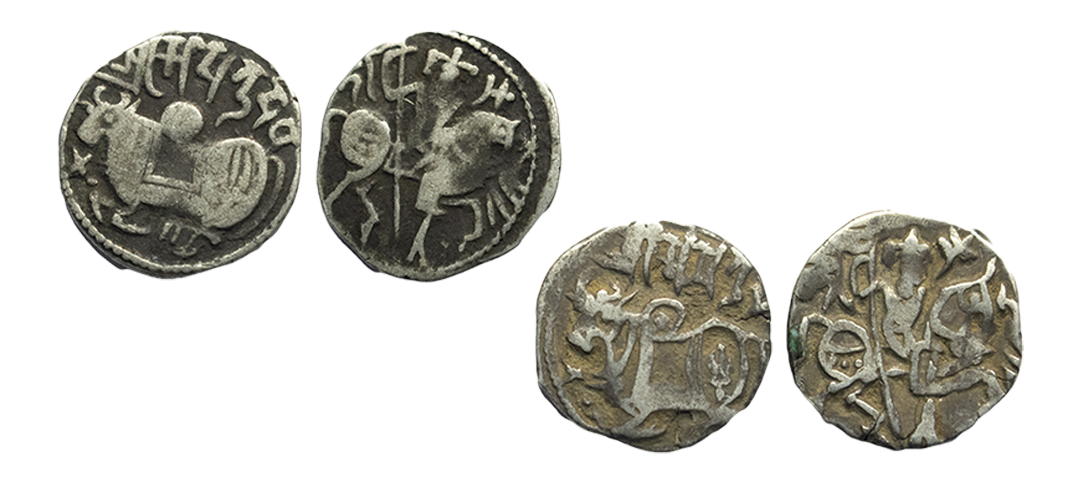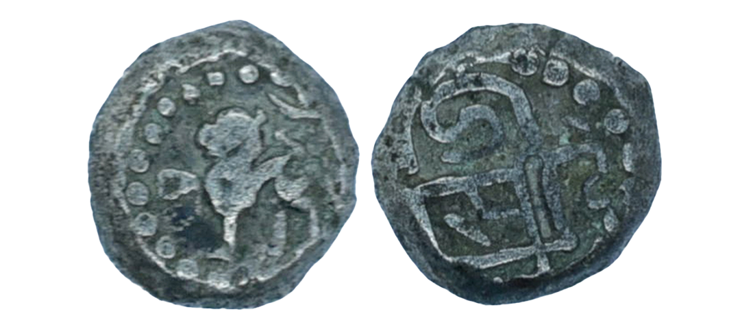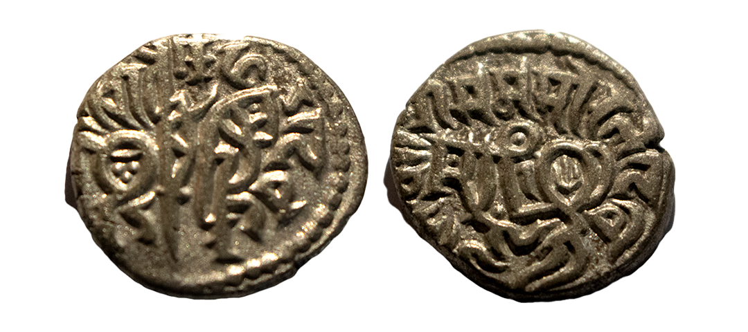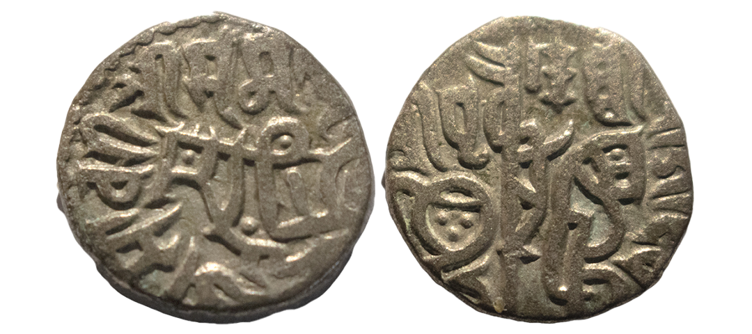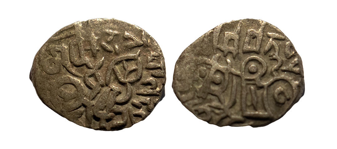 Medieval India, Vijaynagar Kingdom, Harihara II, (c. 1377-1404 AD), Gold 1/2 Varaha, 1.72Grms, OBV: Vishnu seated in padmasana with his wife Lakshmi sitting on his left, Vishnu is holding discus and conch, Rev: Nagari legend in three lines ?Sri Pra tapa hari [hara]. (K Ganesh # 26).