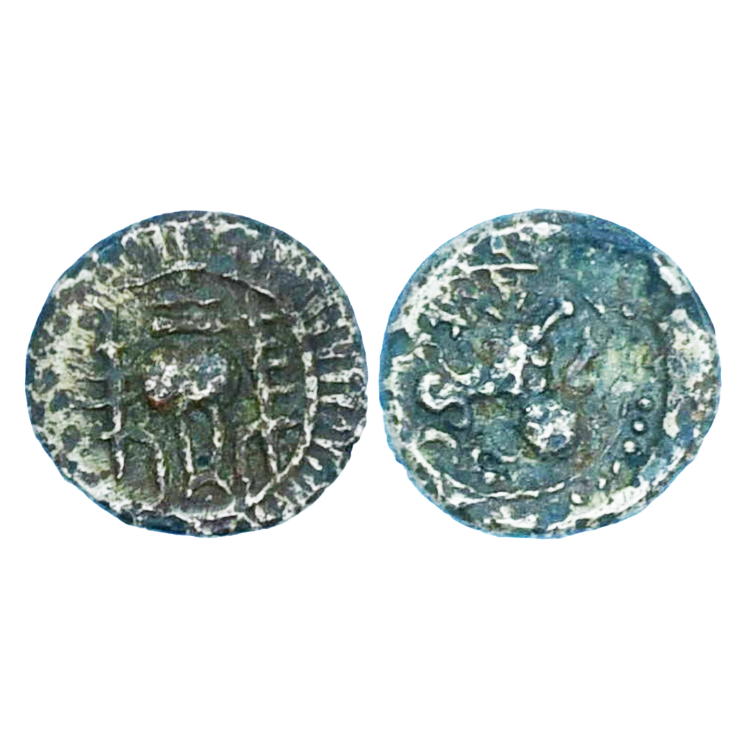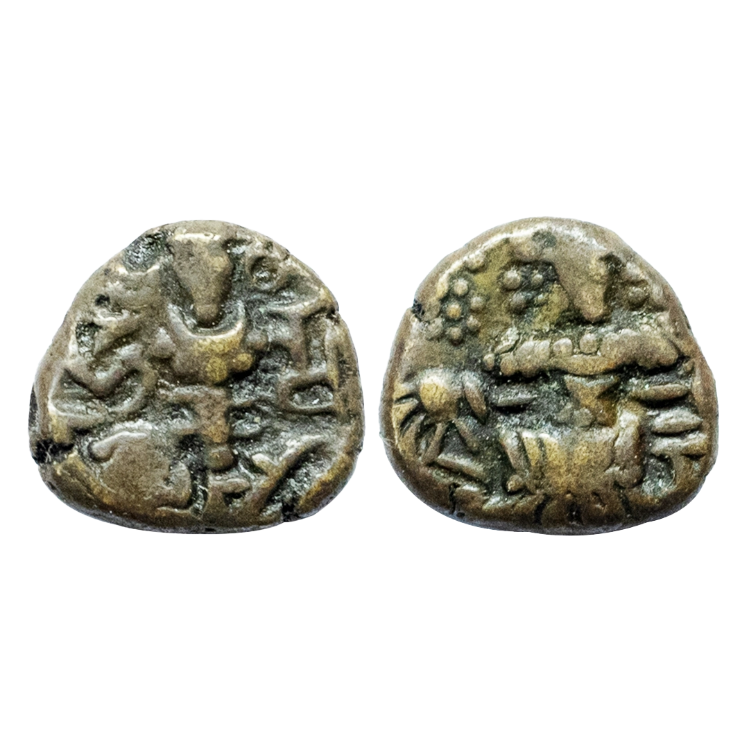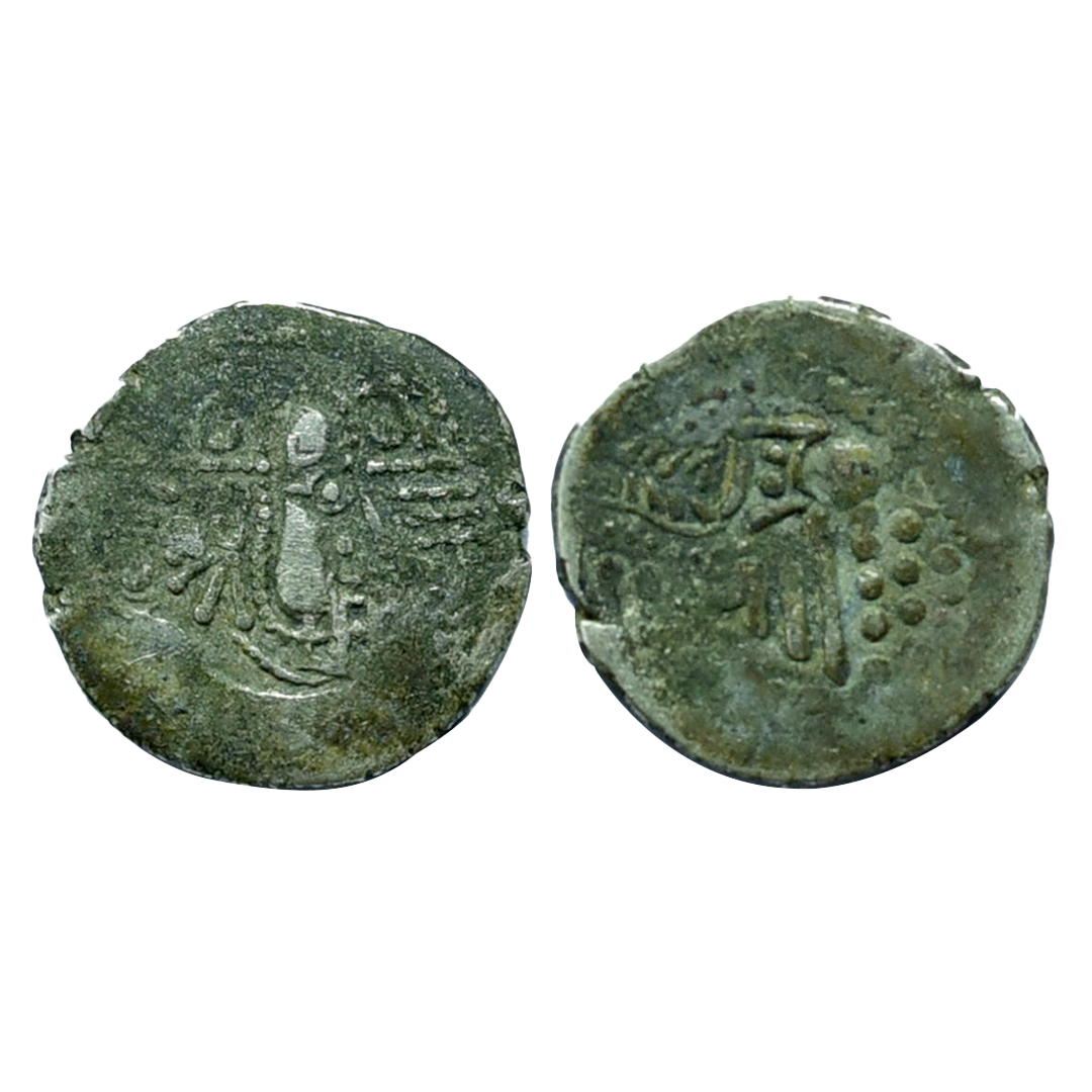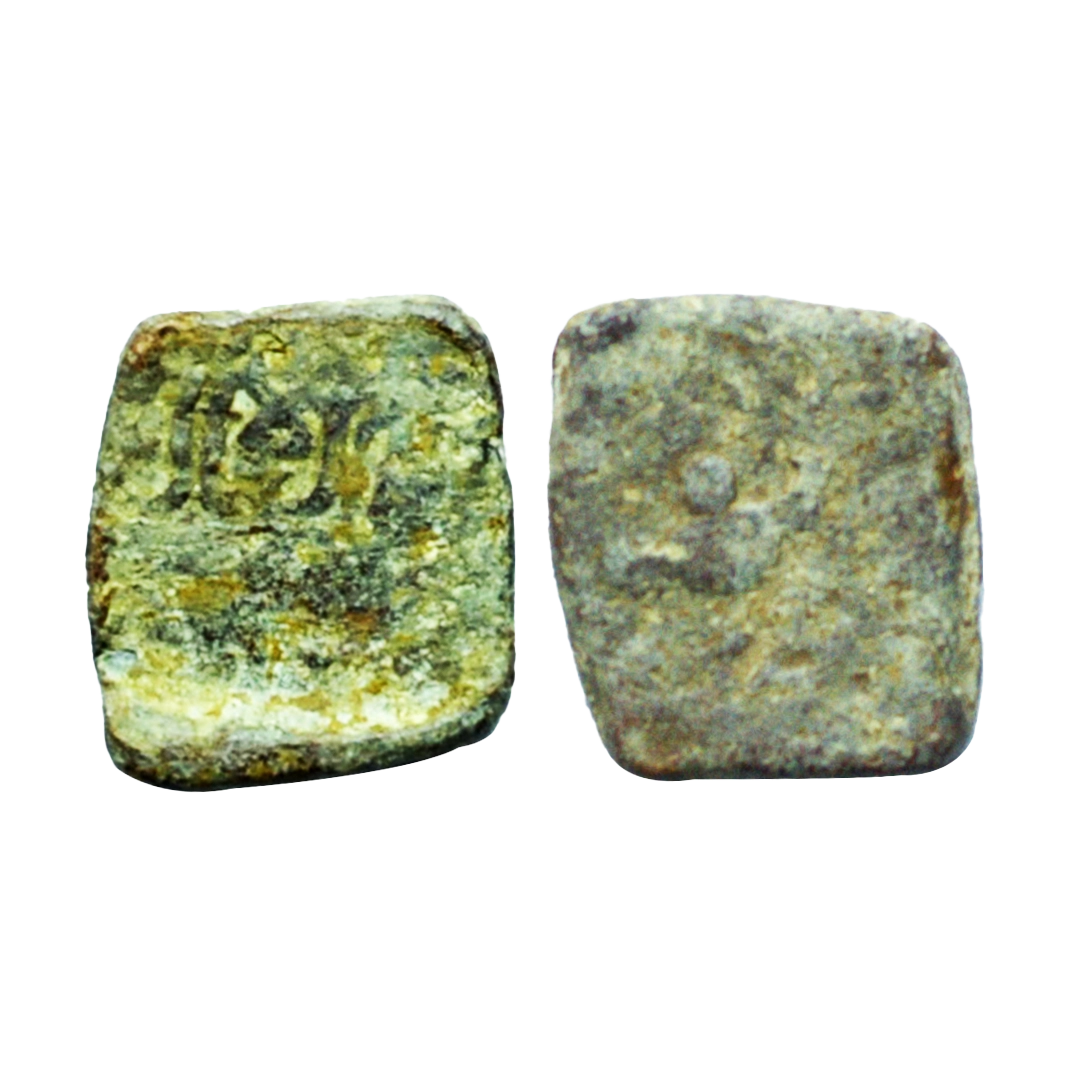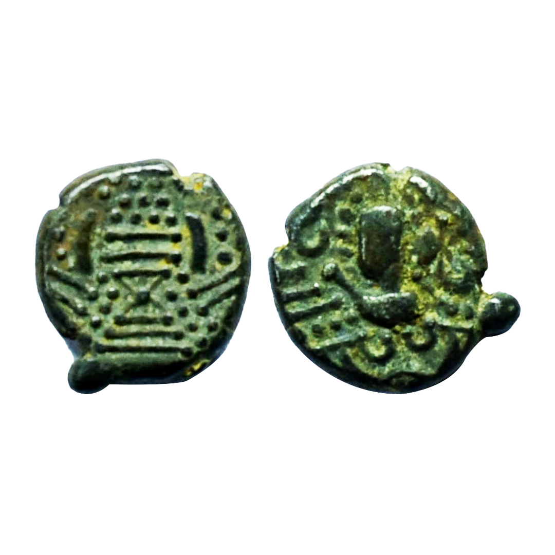 Ancient World, Ceylon Chola, Parakrambahu, Copper Massa, 3.42Grms, Obv: Standing king, lamp at left, globes at right, Rev: King seated right with left arm raised, 4-line Nagari legend below arm ‘Sri Parakram Bahu’. Fine+.