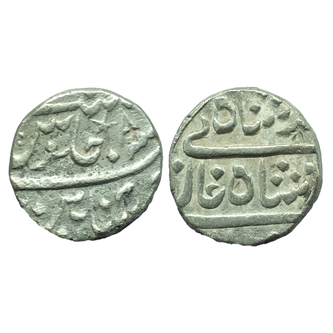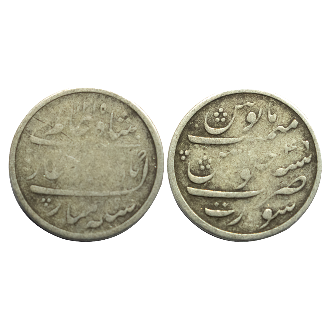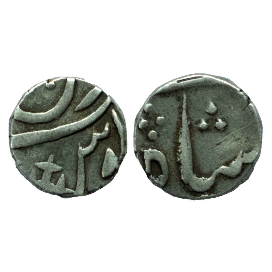 East India Company, Madras Presidency,Silver ¼ Pagoda, 10.27Grms, Obv: Gopuram of a temple with 9 stars on either side, value in English and Persian on buckled garter, Rev: Vishnu surrounded by a dotted border and ribbon with Tamil legend, oblique milling. (KM # 343).