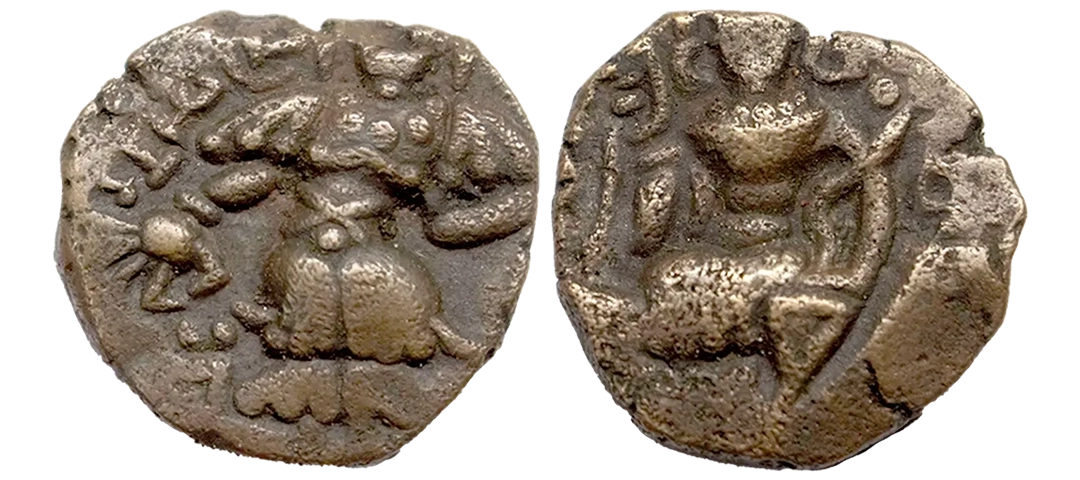 Gupta Empire, Chandragupta II (c. 375-415 AD), ‘Archer’ Type Gold Dinar, Obv: King nimbate, standing left wearing coat, ear-rings, armlets and necklace, head surrounded by halo, holding arrow in the right hand, left hand holding bow at top, 'Chandra' in Brahmi below arm, garuda standard behind and around Brahmi legend worn out, Rev: Goddess Lakshmi seated facing on a lotus, goddess has left hand resting on her knee, holding diadem in her right hand and lotus in left, tamgha to left and Brahmi legend ‘[Sri Vikramah]’ in the right field. (S.Kumar TOTGE # Class III, Var. A). Extremely Fine, Very Rare.
