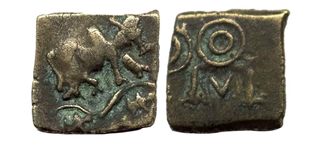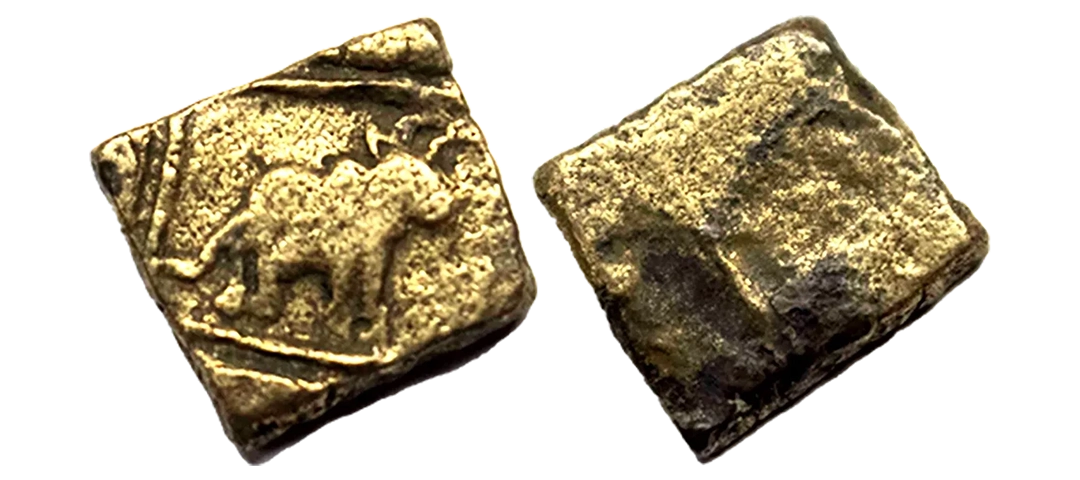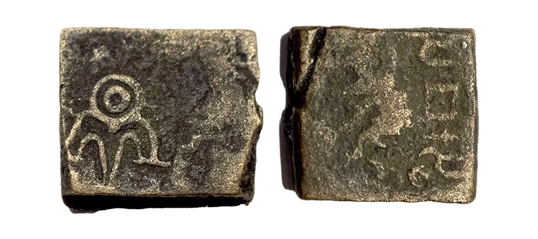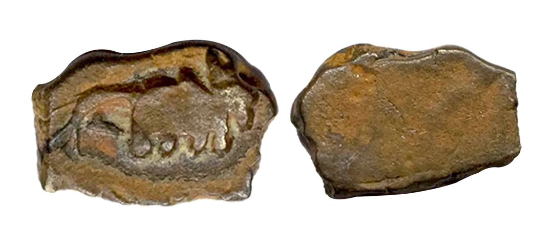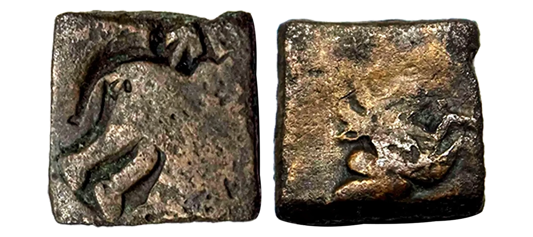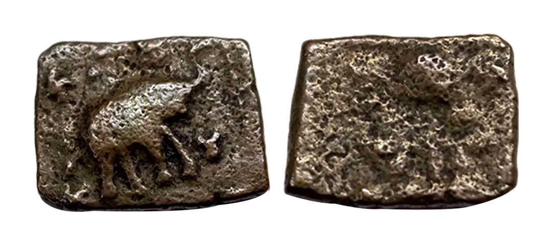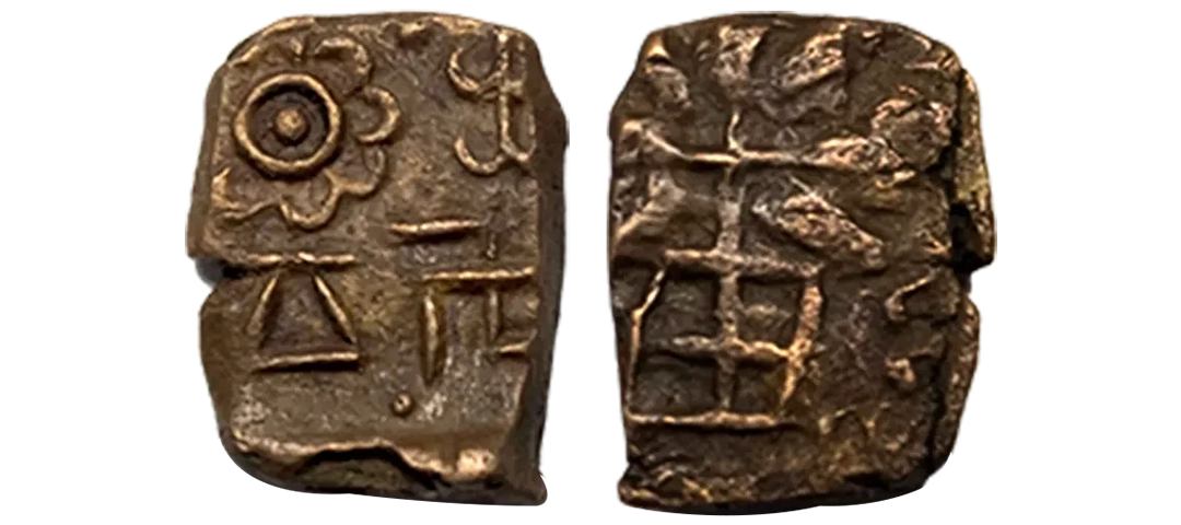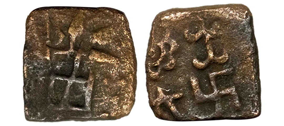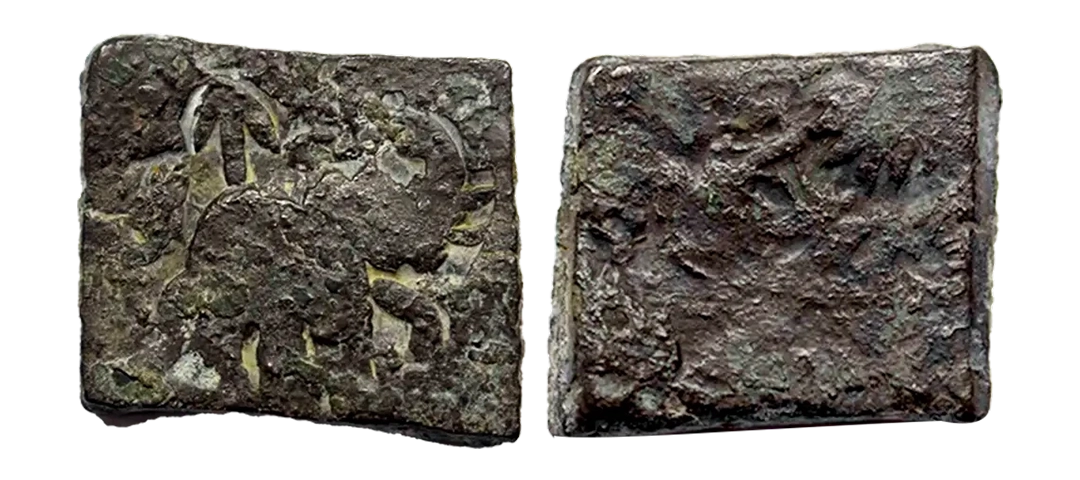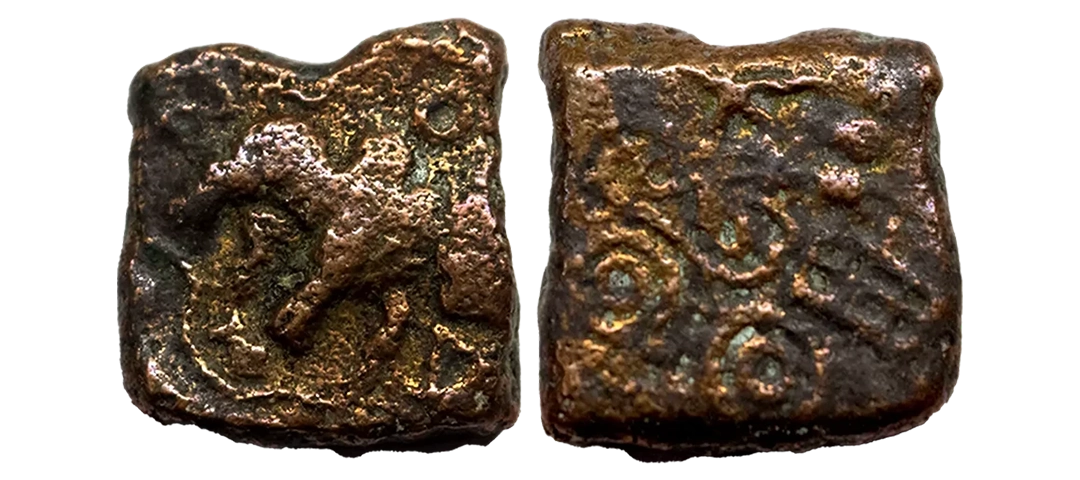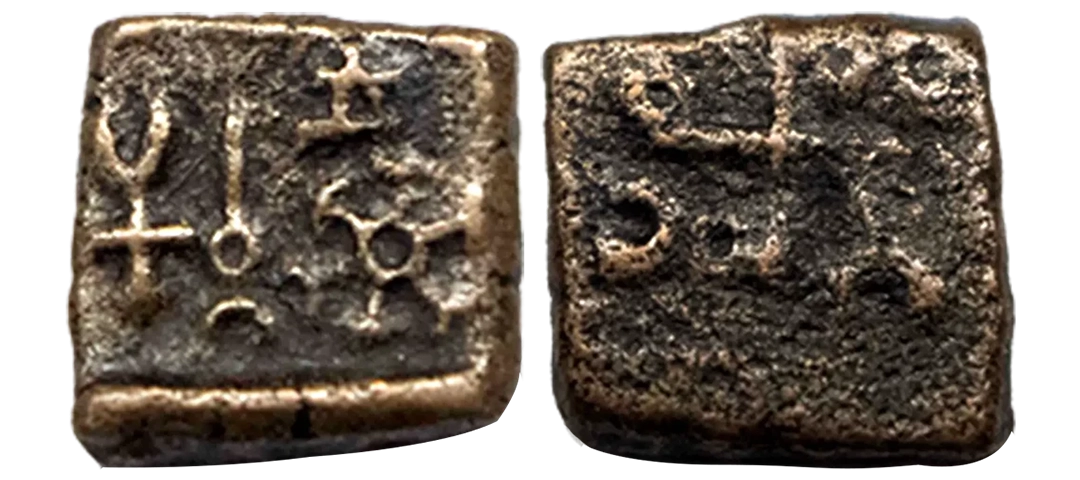Post-Mauryan, Ujjaini Region, Uninscribed type, Copper Unit, obv. Mahakal holding a spear standing beside a tree in railing and others symbols, some with triangular headed standard with taurine, fish tank, ujjaini and river with fishes, rev. four orb ujjaini symbol with a small circle in each orb. 2.61gms, Fine to Very Fine.