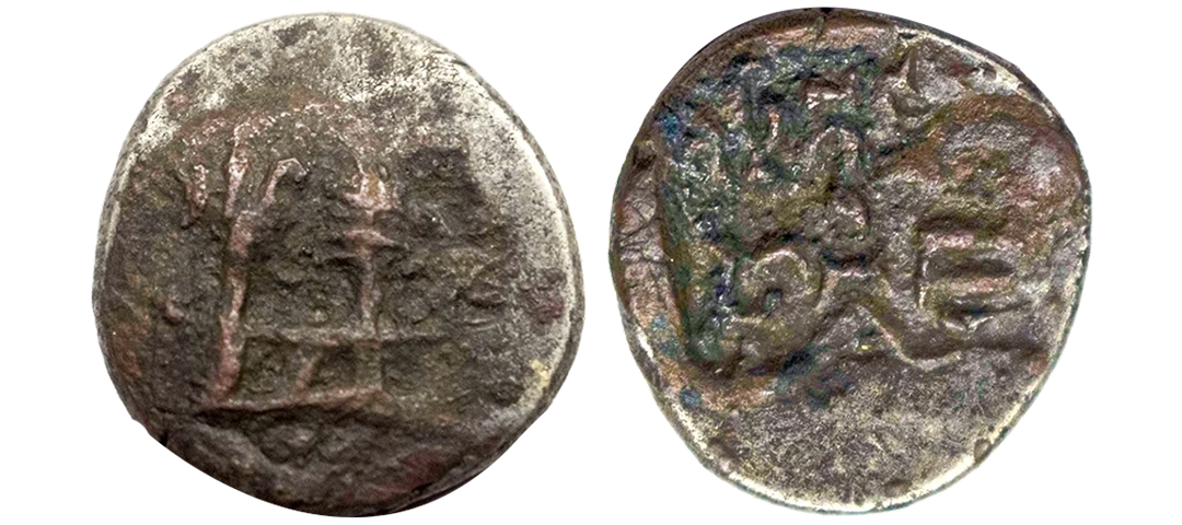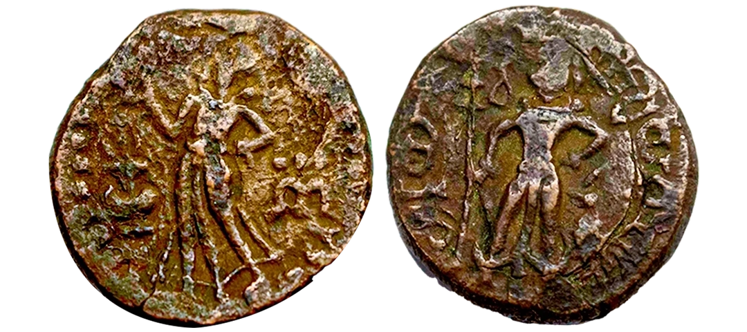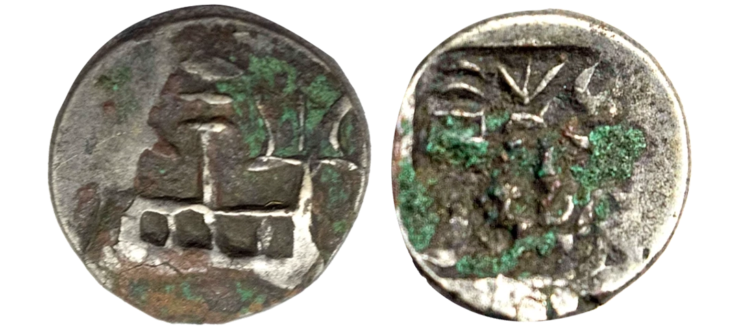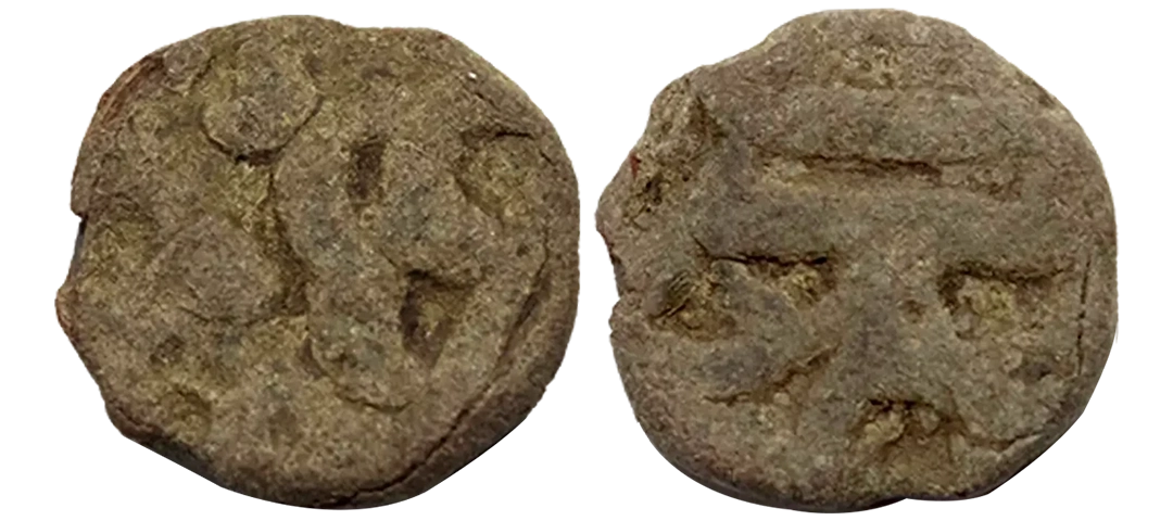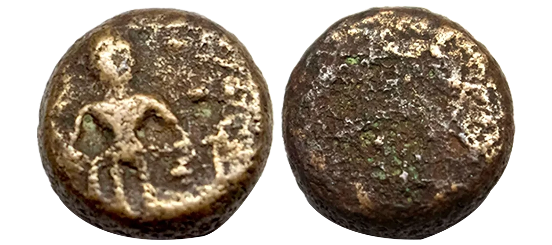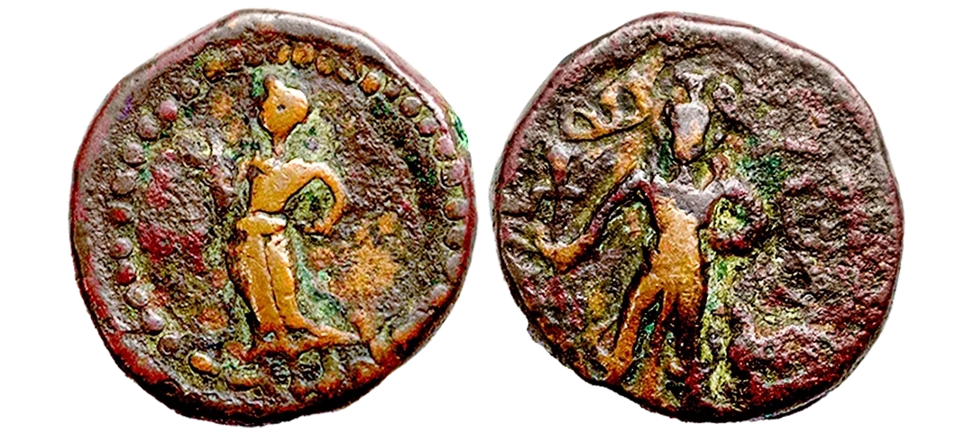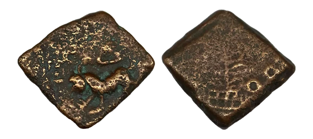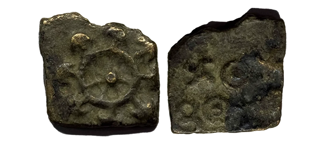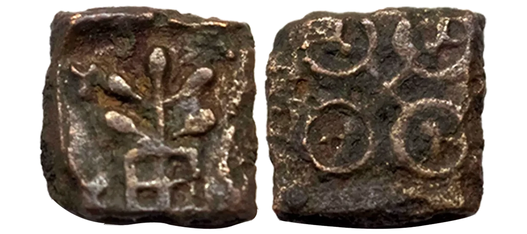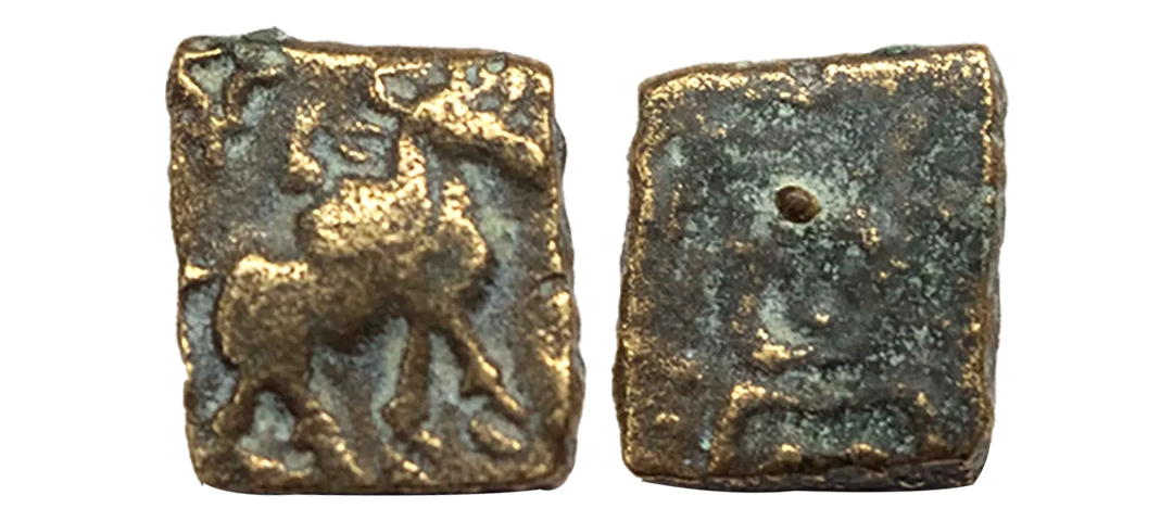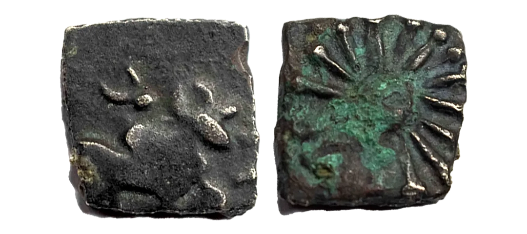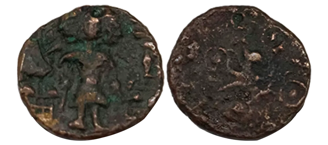 Post-Mauryan, Ujjaini Region, Uninscribed type, Copper Unit, obv. Mahakal holding a spear standing beside a tree in railing and others symbols, some with triangular headed standard with taurine, fish tank, ujjaini and river with fishes, rev. four orb ujjaini symbol with a small circle in each orb. 2.61gms, Fine to Very Fine.