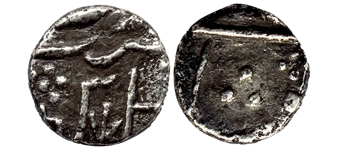 Tripura, Rama Manikya (1676-1685 AD), Silver ¼ Tanka, 2.26g, SE 1598. Obv: Lion facing left, crescent and dot above. Rev: Bangla legend Sri Sri Yu / ta (Shiva Ling) Ra / ma Devah in three lines, (R&B T-219). About Extremely Fine, Very Rare.
