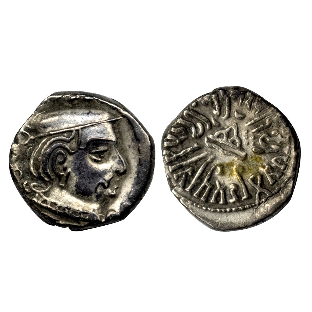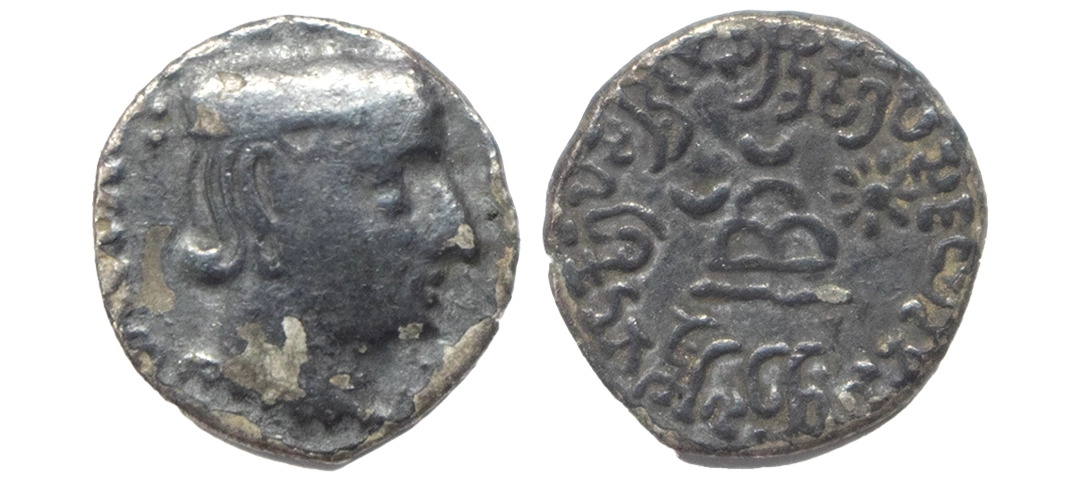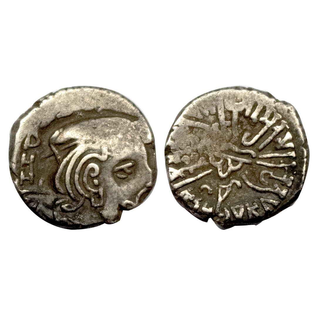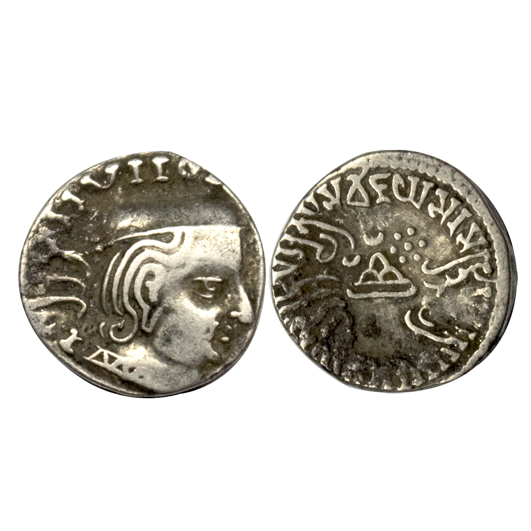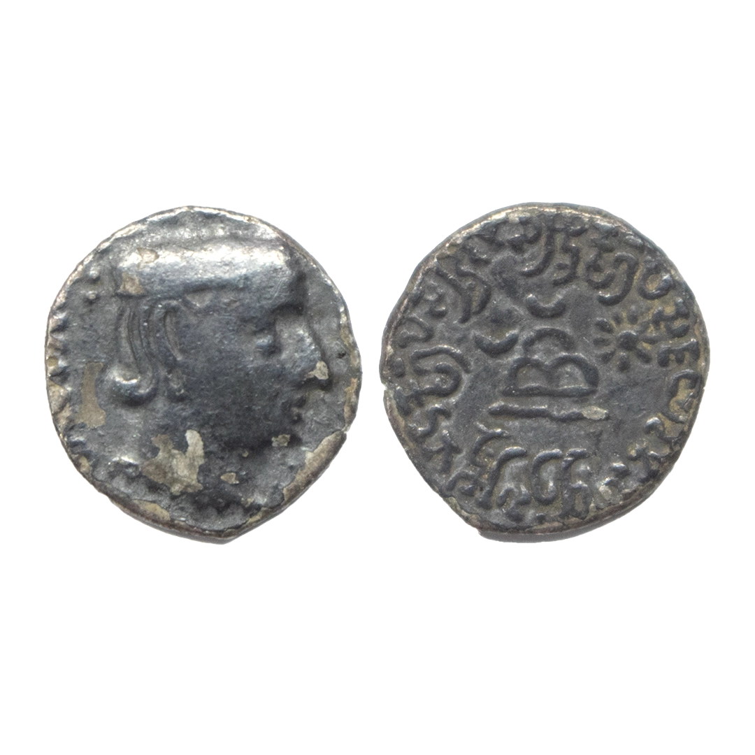 Western Kshatrapas, Rudradaman I s/o Jayadaman (c. 141-165 AD), as Mahakshatrapa, Silver Drachma, 4.15Grms, Obv: Bust of king facing to right with greek letters, Rev: Three arched hill with crescent above, sun on right and moon to left, around Brahmi legend ‘Rajno kshatrapasa Jayadamasaputrasa Rajno mahakshatrapas Rudradamasa’. (Pieper # 3366). Very Fine+.