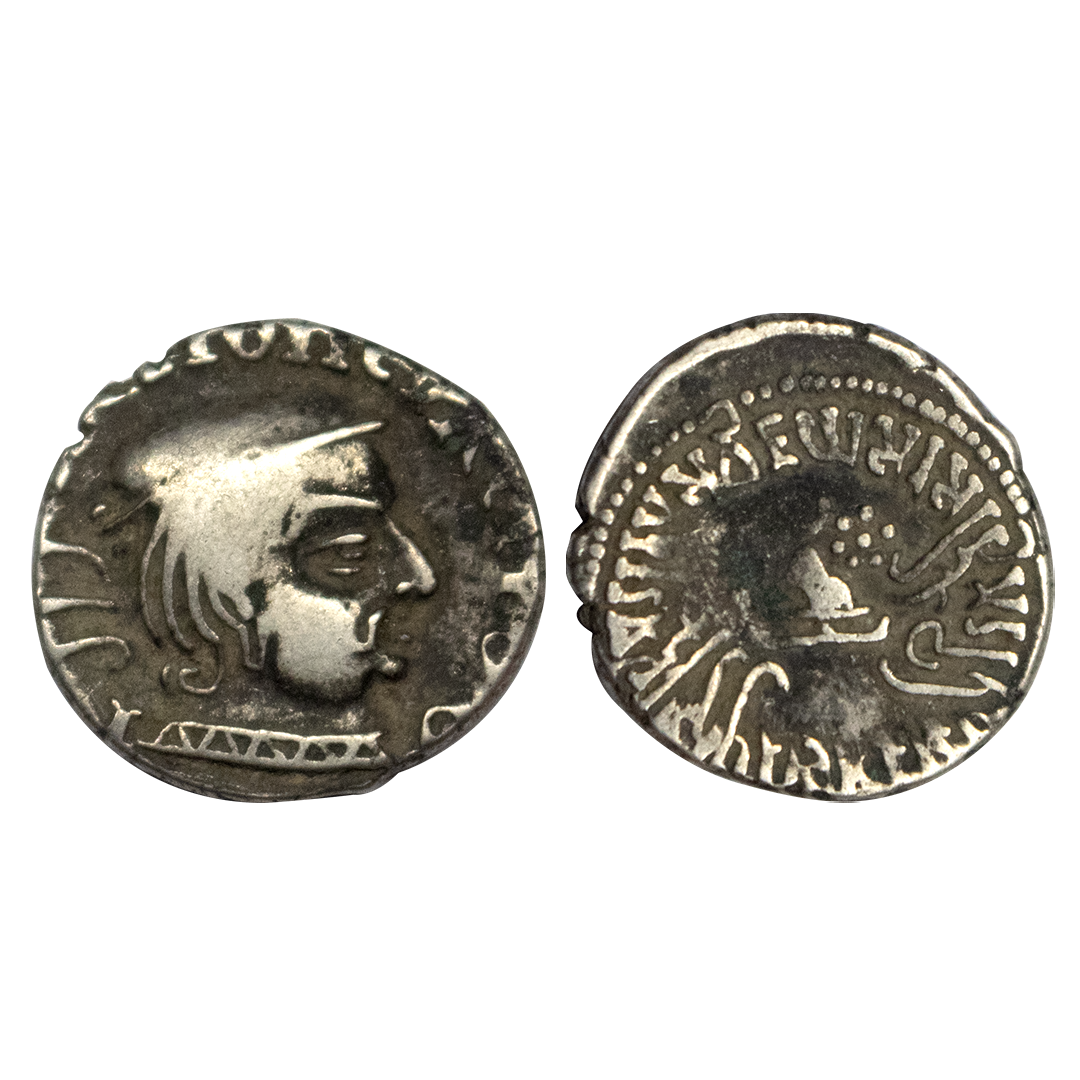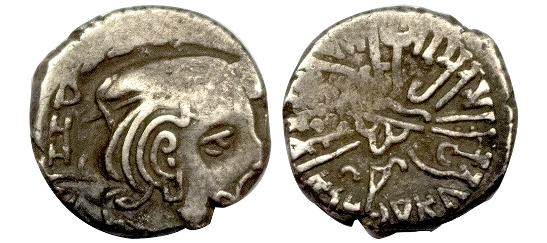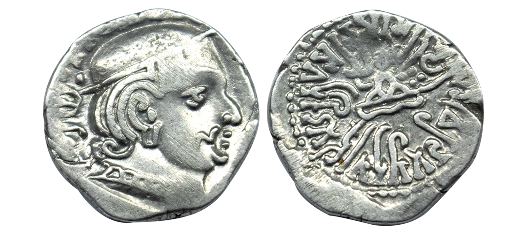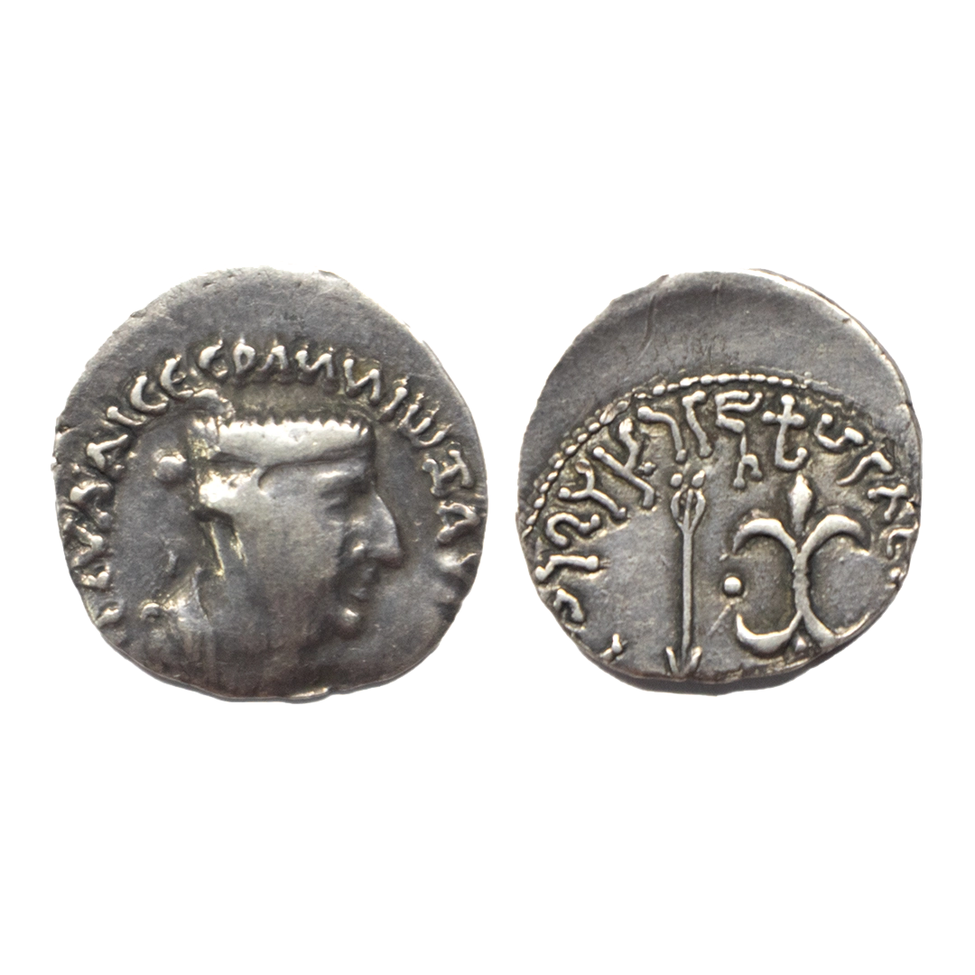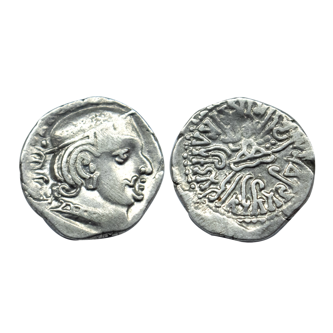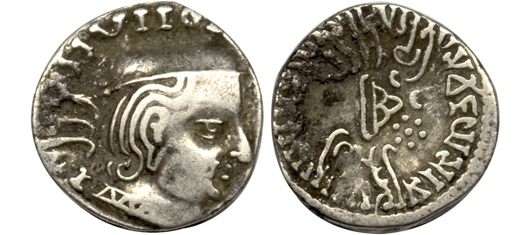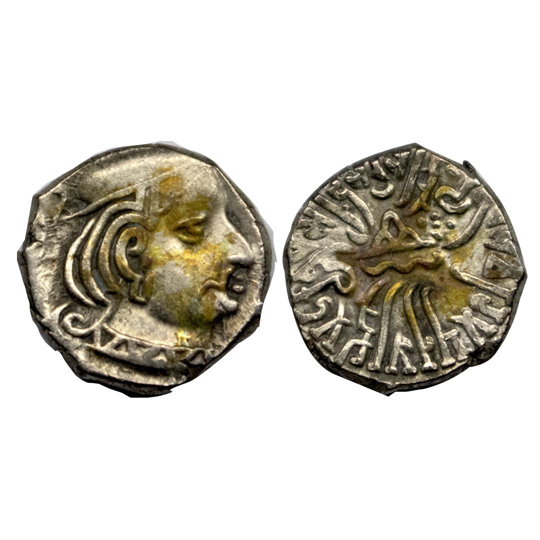 Western Kshatrapas, Rudradaman I s/o Jayadaman (c. 141-165 AD), as Mahakshatrapa, Silver Drachma, 4.15Grms, Obv: Bust of king facing to right with greek letters, Rev: Three arched hill with crescent above, sun on right and moon to left, around Brahmi legend ‘Rajno kshatrapasa Jayadamasaputrasa Rajno mahakshatrapas Rudradamasa’. (Pieper # 3366). Very Fine+.