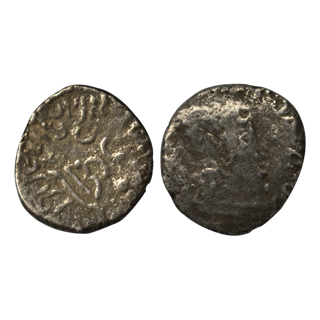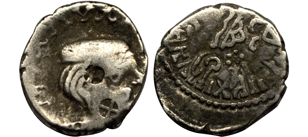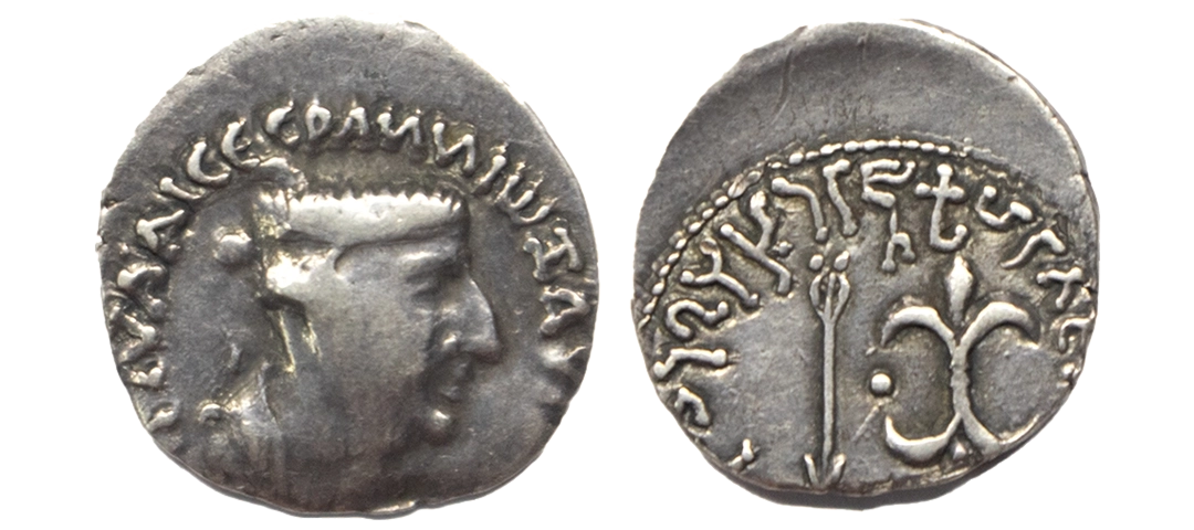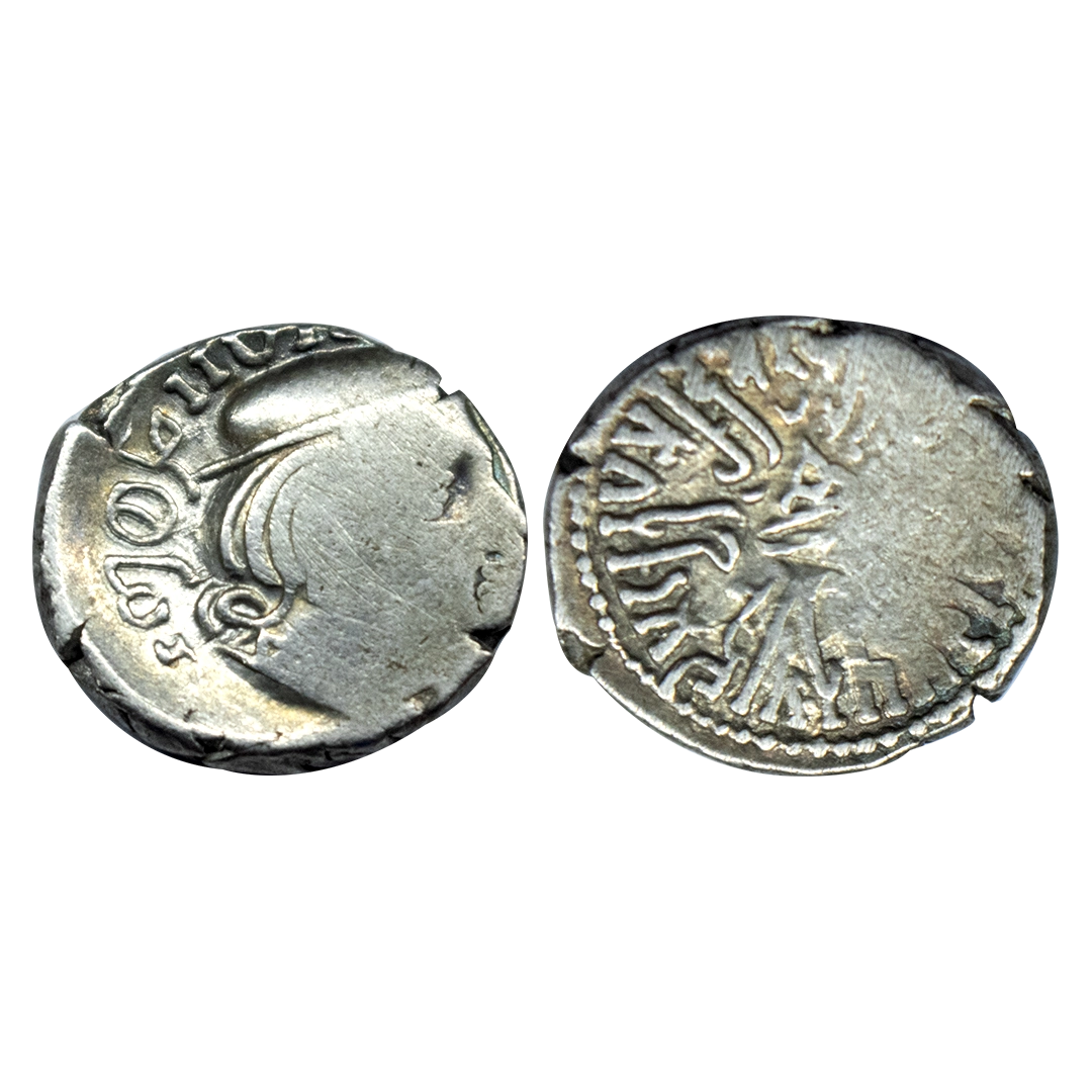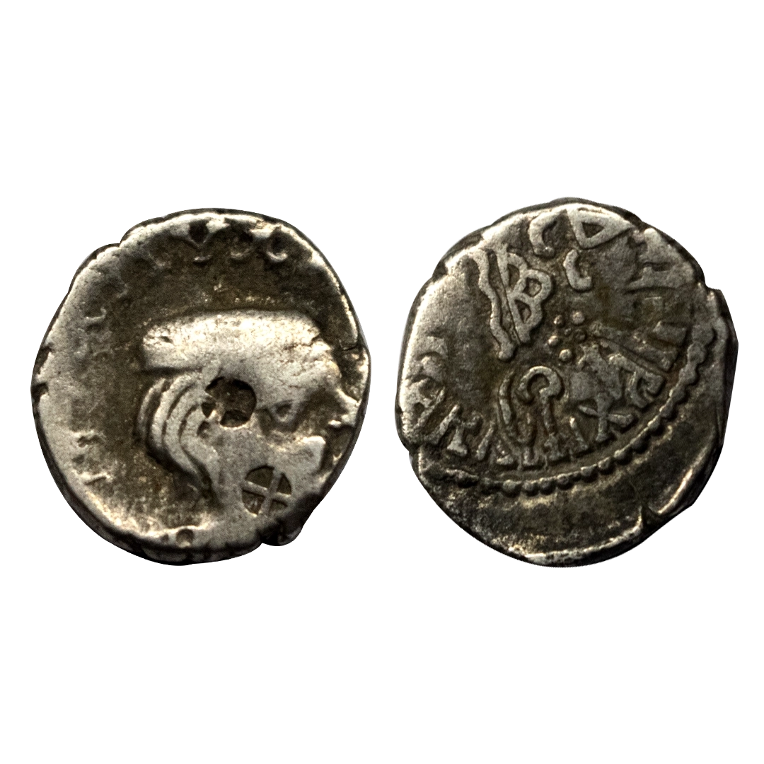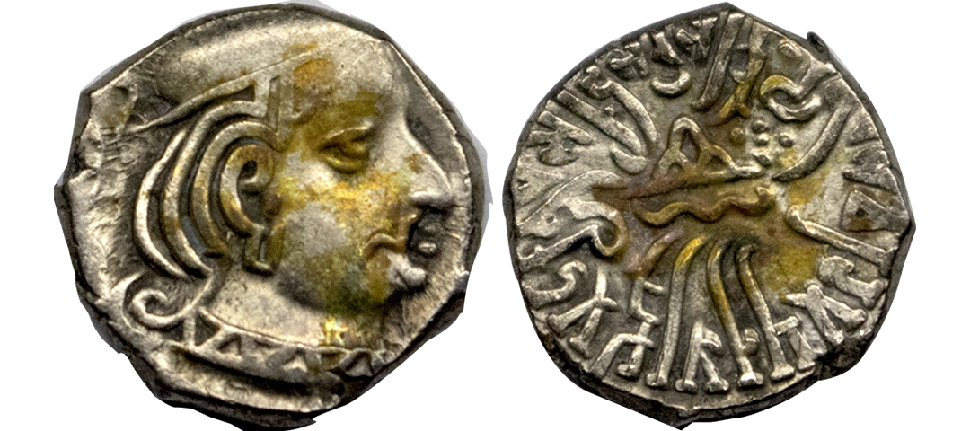 Western Kshatrapas, Rudradaman I s/o Jayadaman (c. 141-165 AD), as Mahakshatrapa, Silver Drachma, 4.15Grms, Obv: Bust of king facing to right with greek letters, Rev: Three arched hill with crescent above, sun on right and moon to left, around Brahmi legend ‘Rajno kshatrapasa Jayadamasaputrasa Rajno mahakshatrapas Rudradamasa’. (Pieper # 3366). Very Fine+.