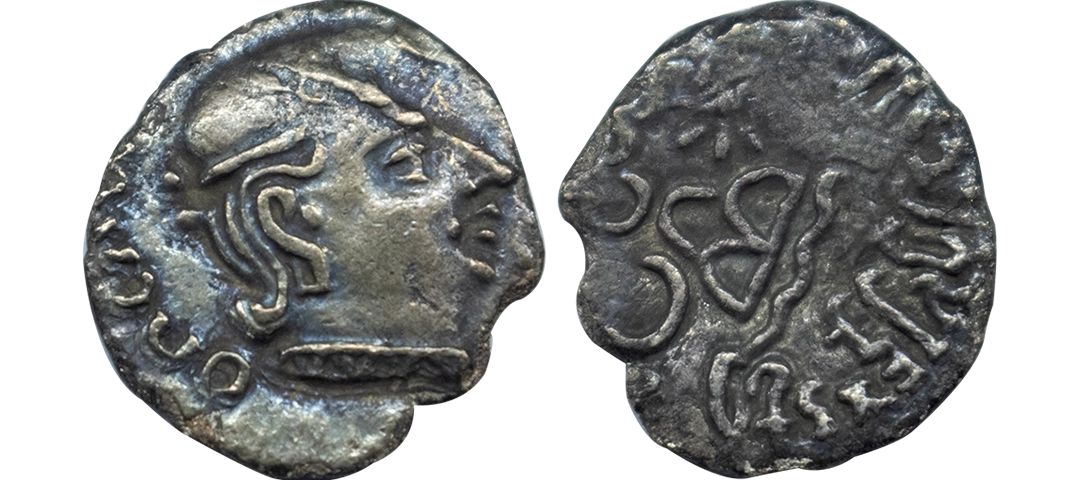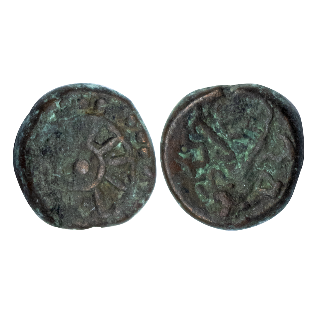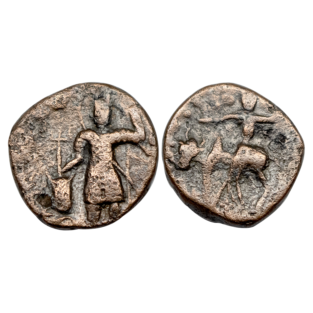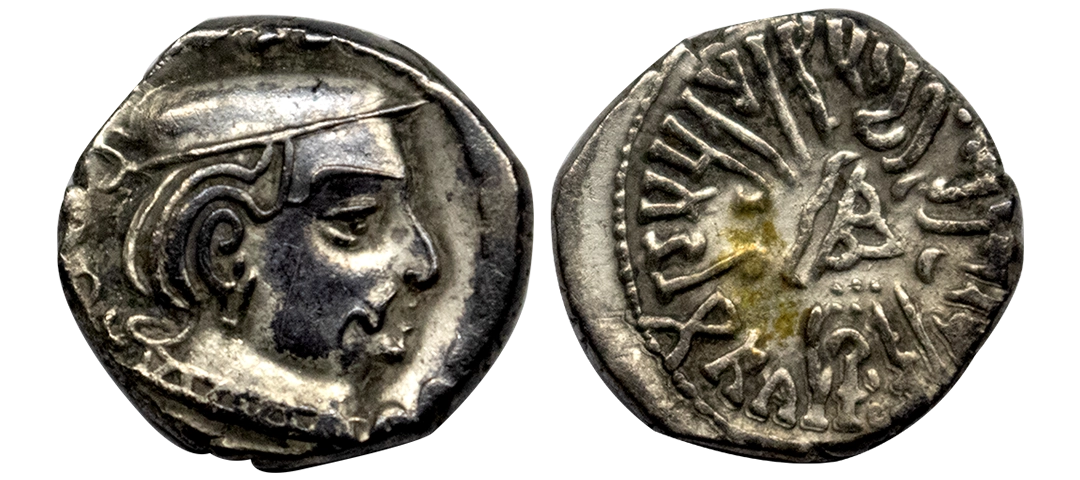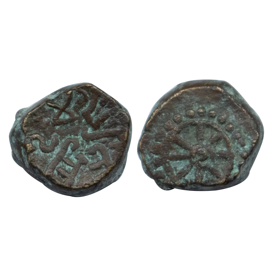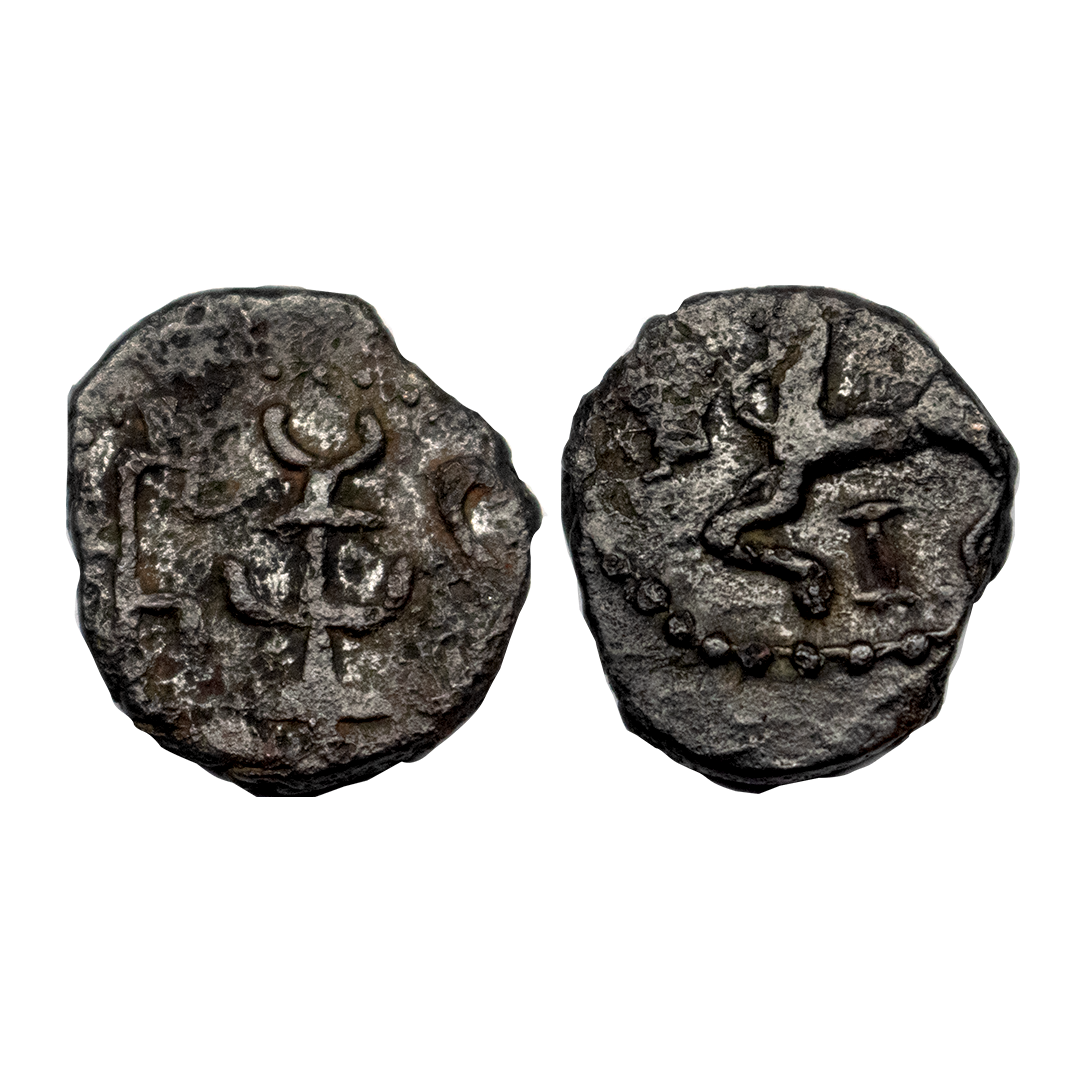 Western Kshatrapas, Rudradaman I s/o Jayadaman (c. 141-165 AD), as Mahakshatrapa, Silver Drachma, 4.15Grms, Obv: Bust of king facing to right with greek letters, Rev: Three arched hill with crescent above, sun on right and moon to left, around Brahmi legend ‘Rajno kshatrapasa Jayadamasaputrasa Rajno mahakshatrapas Rudradamasa’. (Pieper # 3366). Very Fine+.