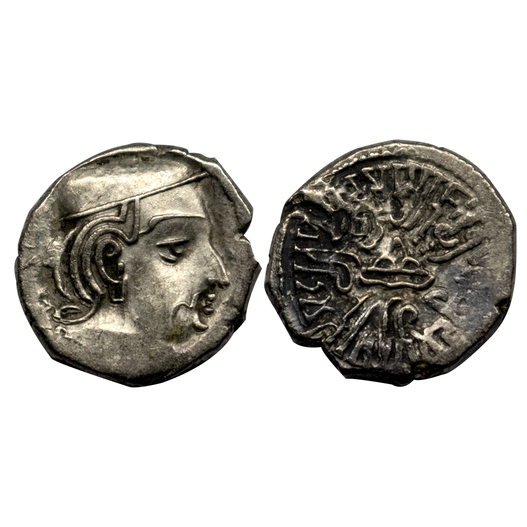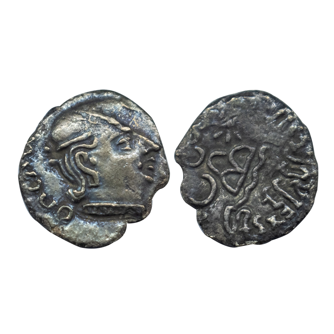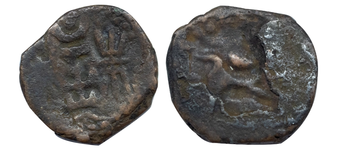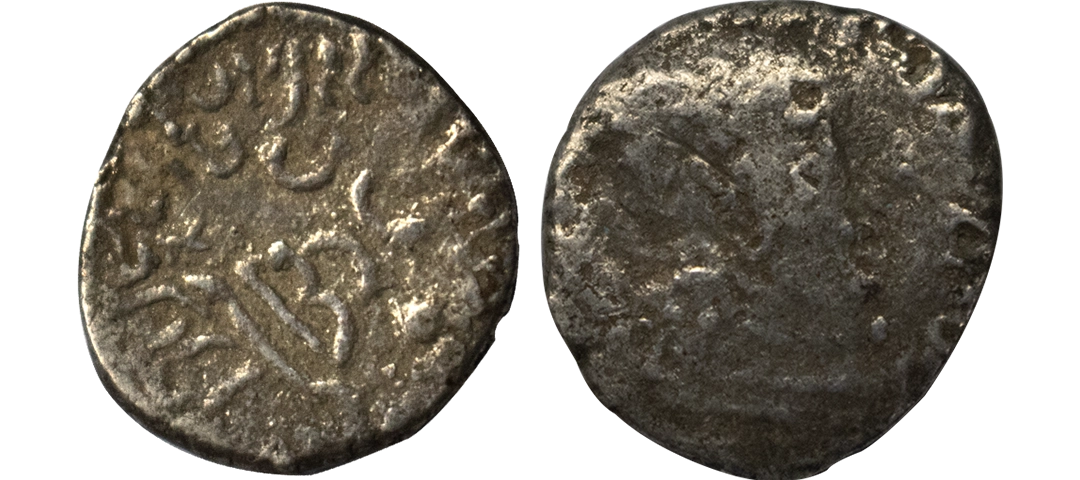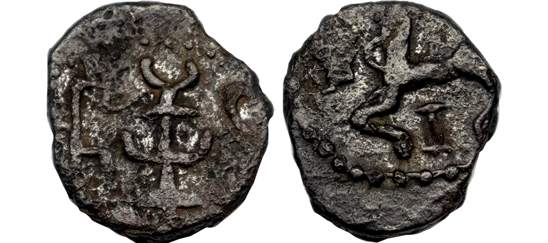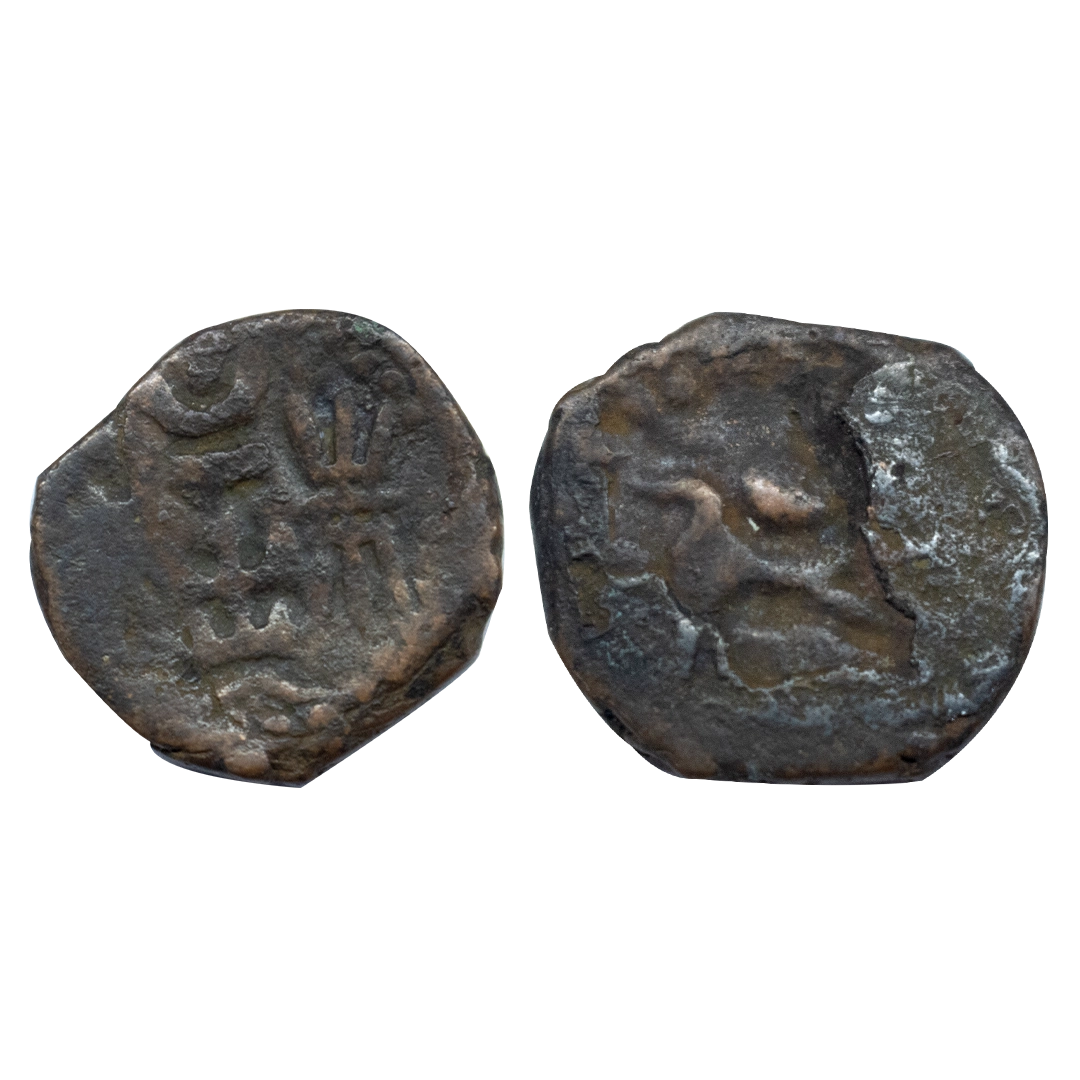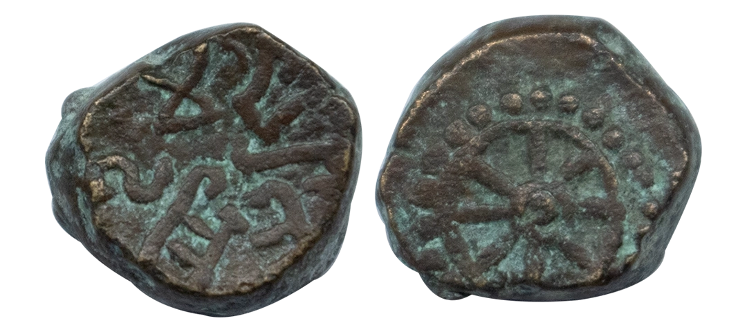 Western Kshatrapas, Rudradaman I s/o Jayadaman (c. 141-165 AD), as Mahakshatrapa, Silver Drachma, 4.15Grms, Obv: Bust of king facing to right with greek letters, Rev: Three arched hill with crescent above, sun on right and moon to left, around Brahmi legend ‘Rajno kshatrapasa Jayadamasaputrasa Rajno mahakshatrapas Rudradamasa’. (Pieper # 3366). Very Fine+.